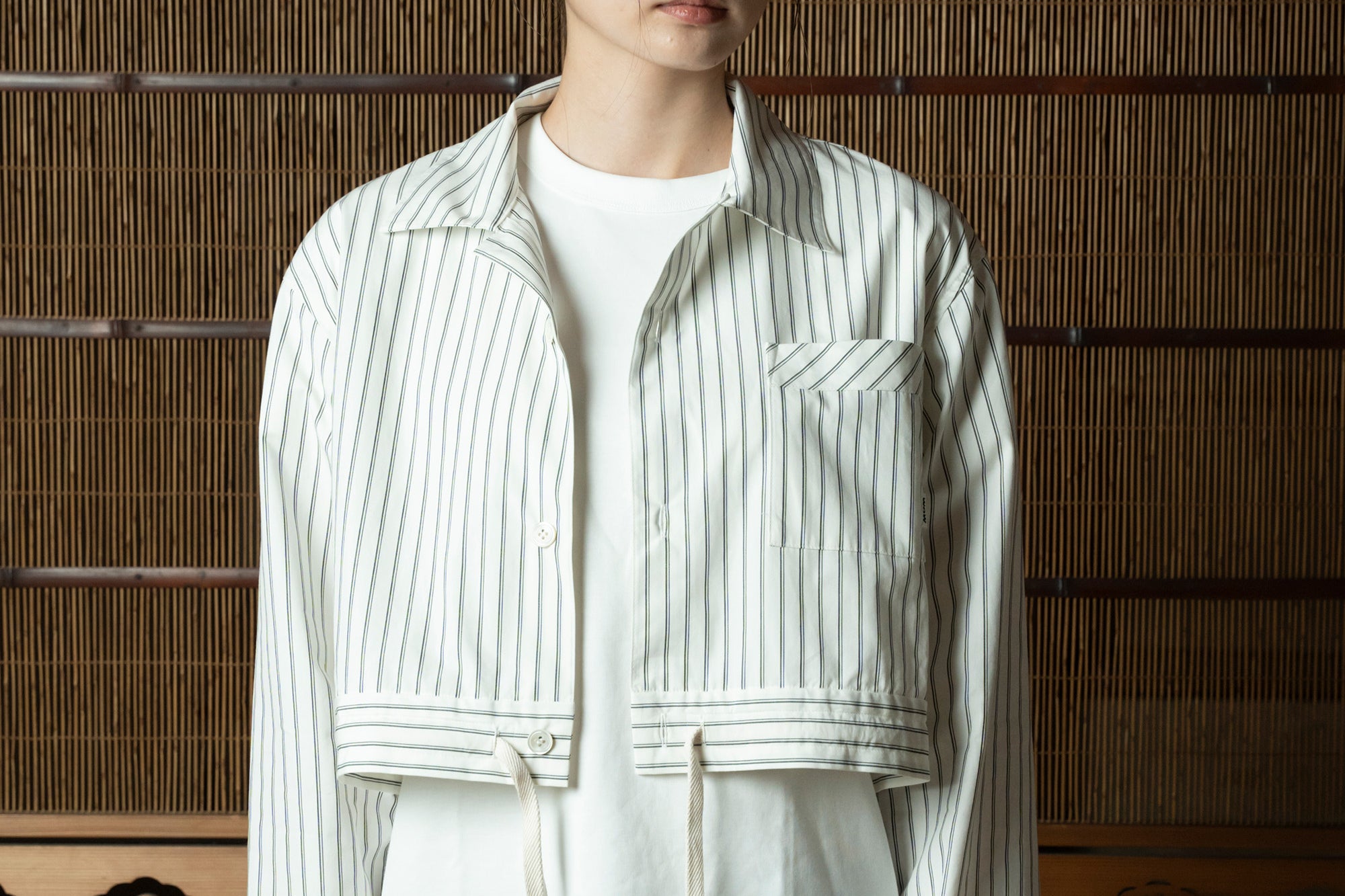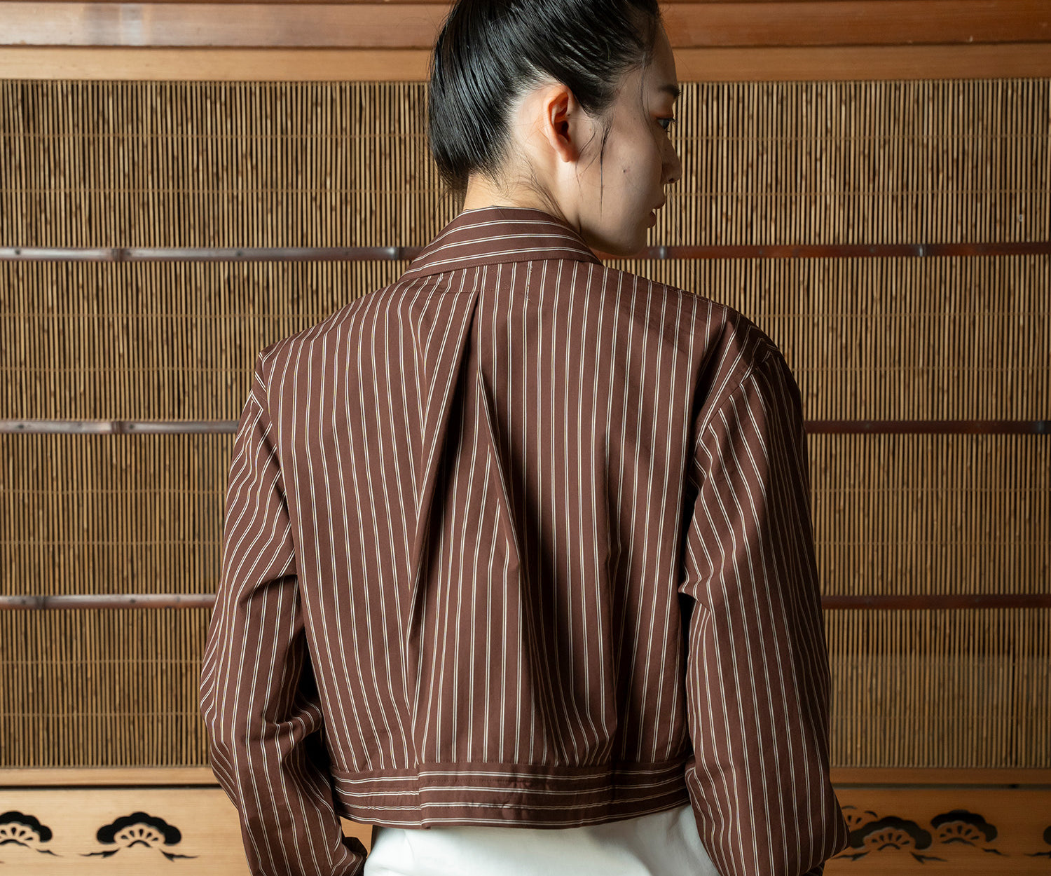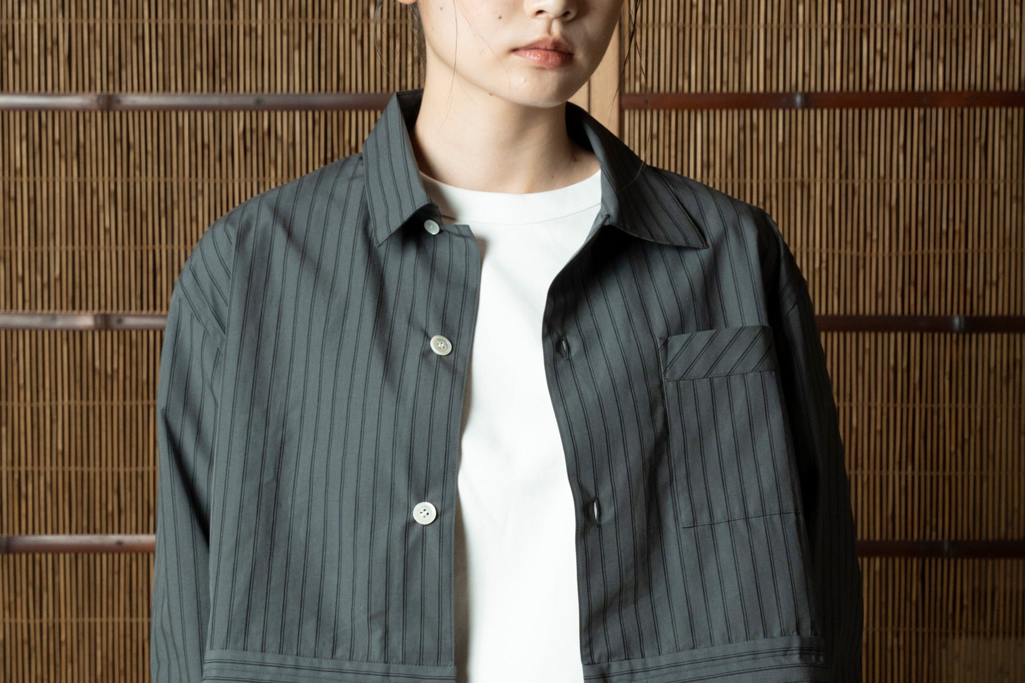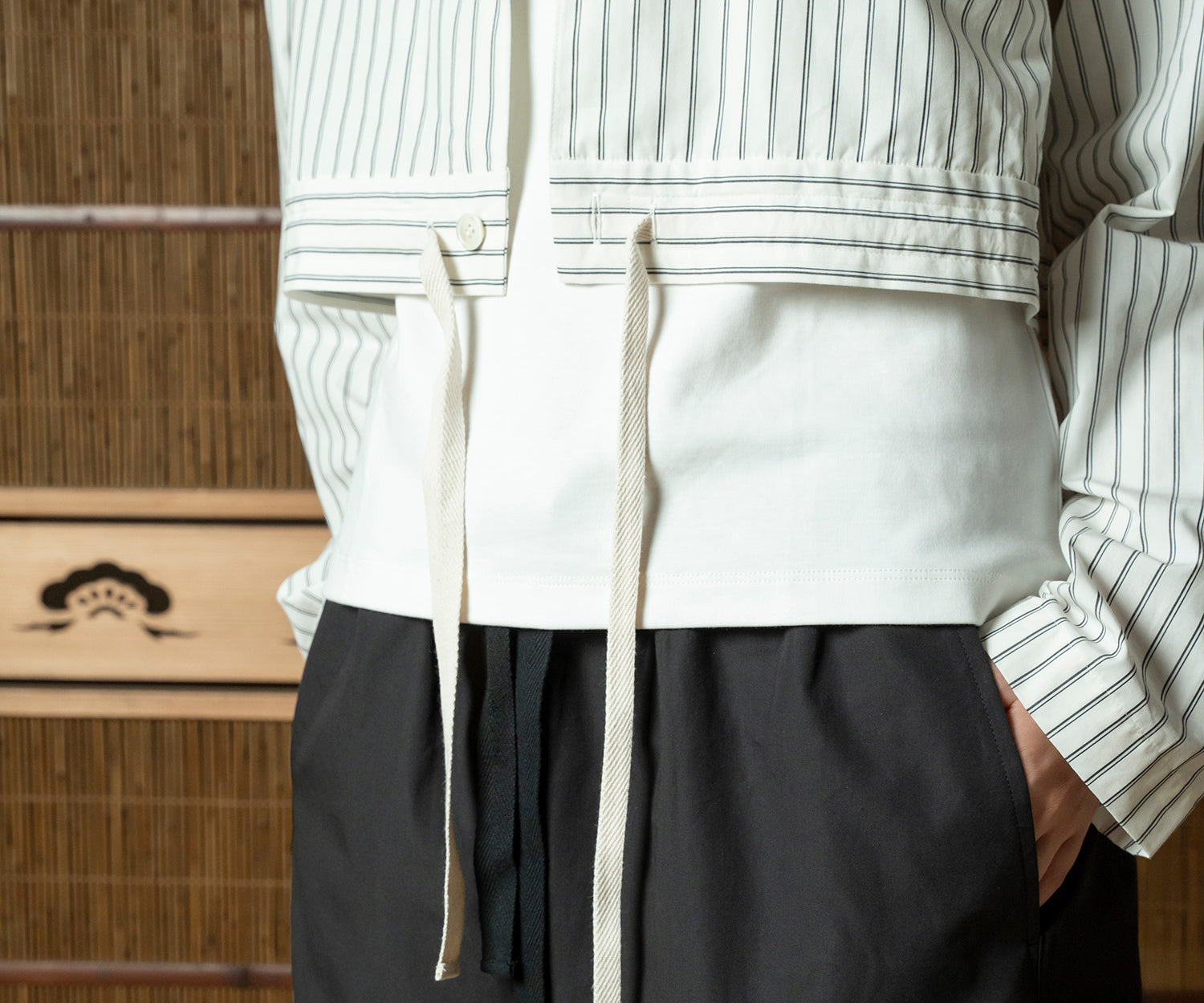 ボリュームのある背中心にプリーツの入ったボックスシルエットのオーセンティックなパジャマシャツ。丈は短めのクロップド丈で、さらに裾にドローコードを入れることによりシルエットの変化も可能です。ルームウェアとしての枠にとどまらず、「いつでもどこでも」着られるをテーマに、独自のバランスに仕立てました。