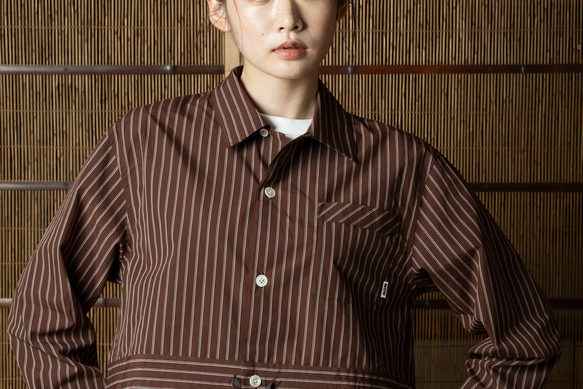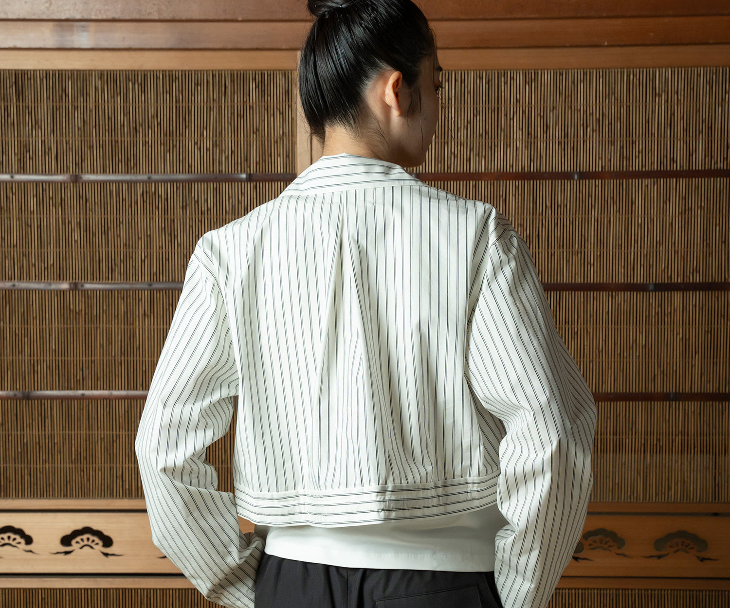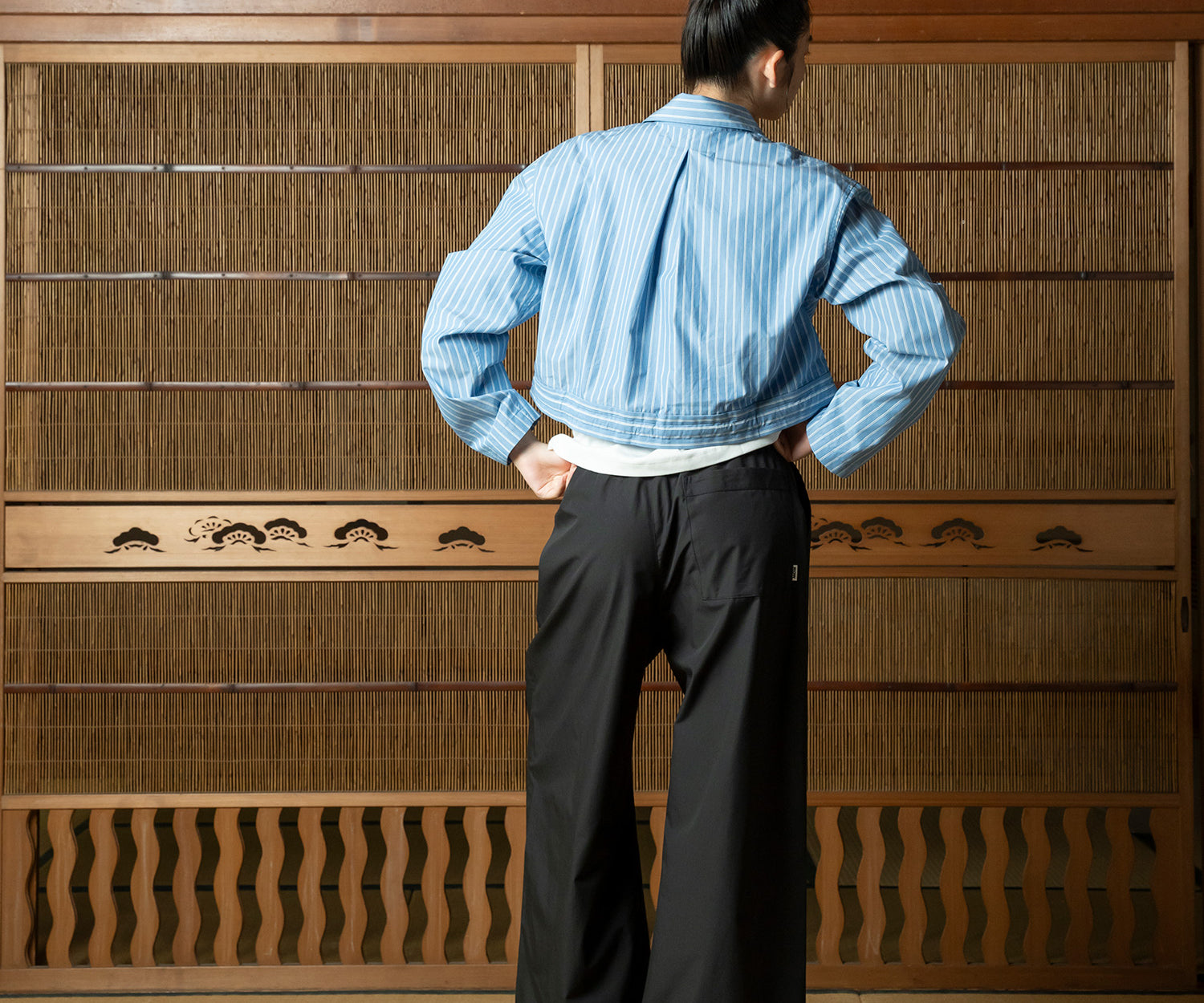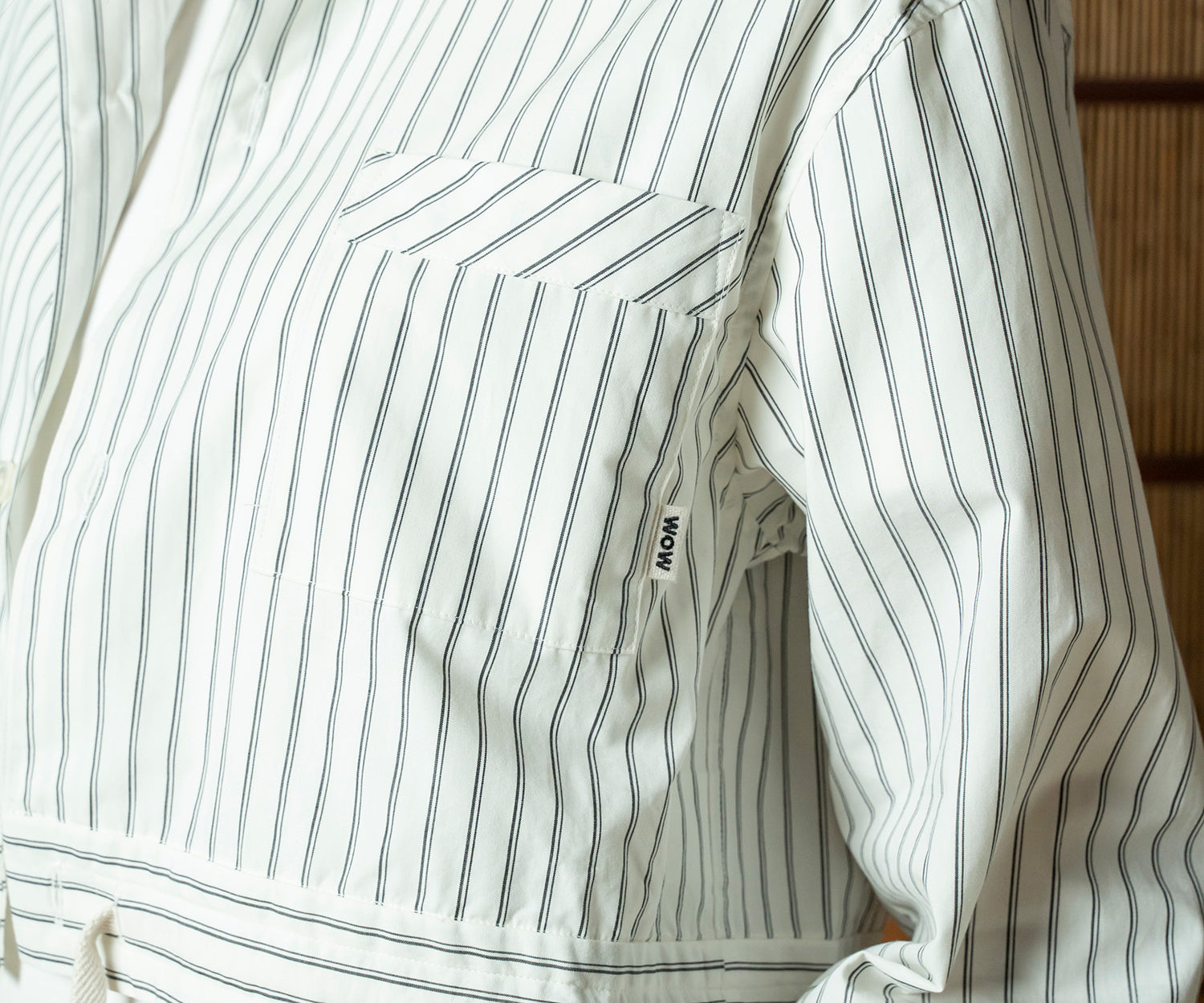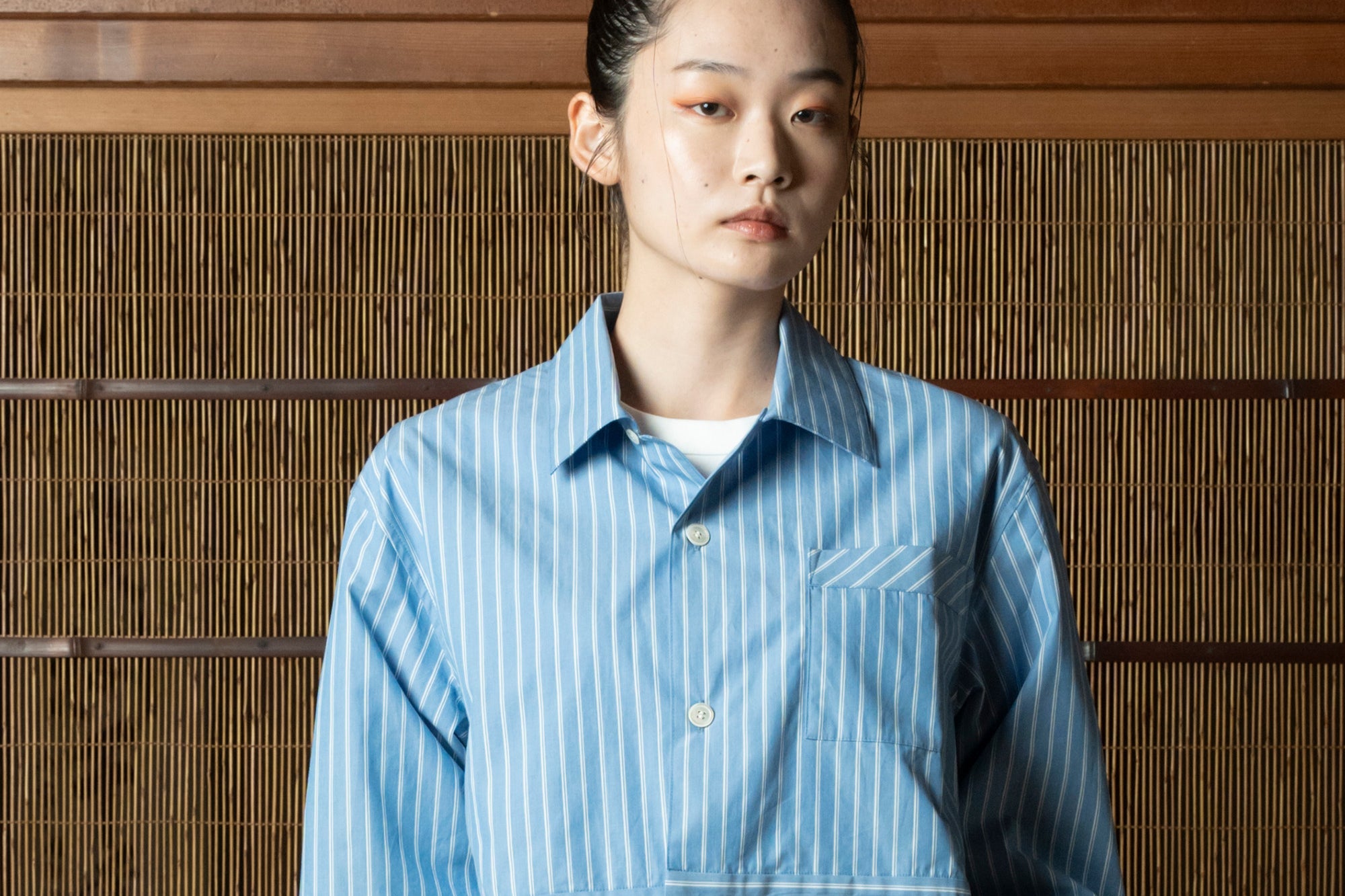 ボリュームのある背中心にプリーツの入ったボックスシルエットのオーセンティックなパジャマシャツ。丈は短めのクロップド丈で、さらに裾にドローコードを入れることによりシルエットの変化も可能です。ルームウェアとしての枠にとどまらず、「いつでもどこでも」着られるをテーマに、独自のバランスに仕立てました。