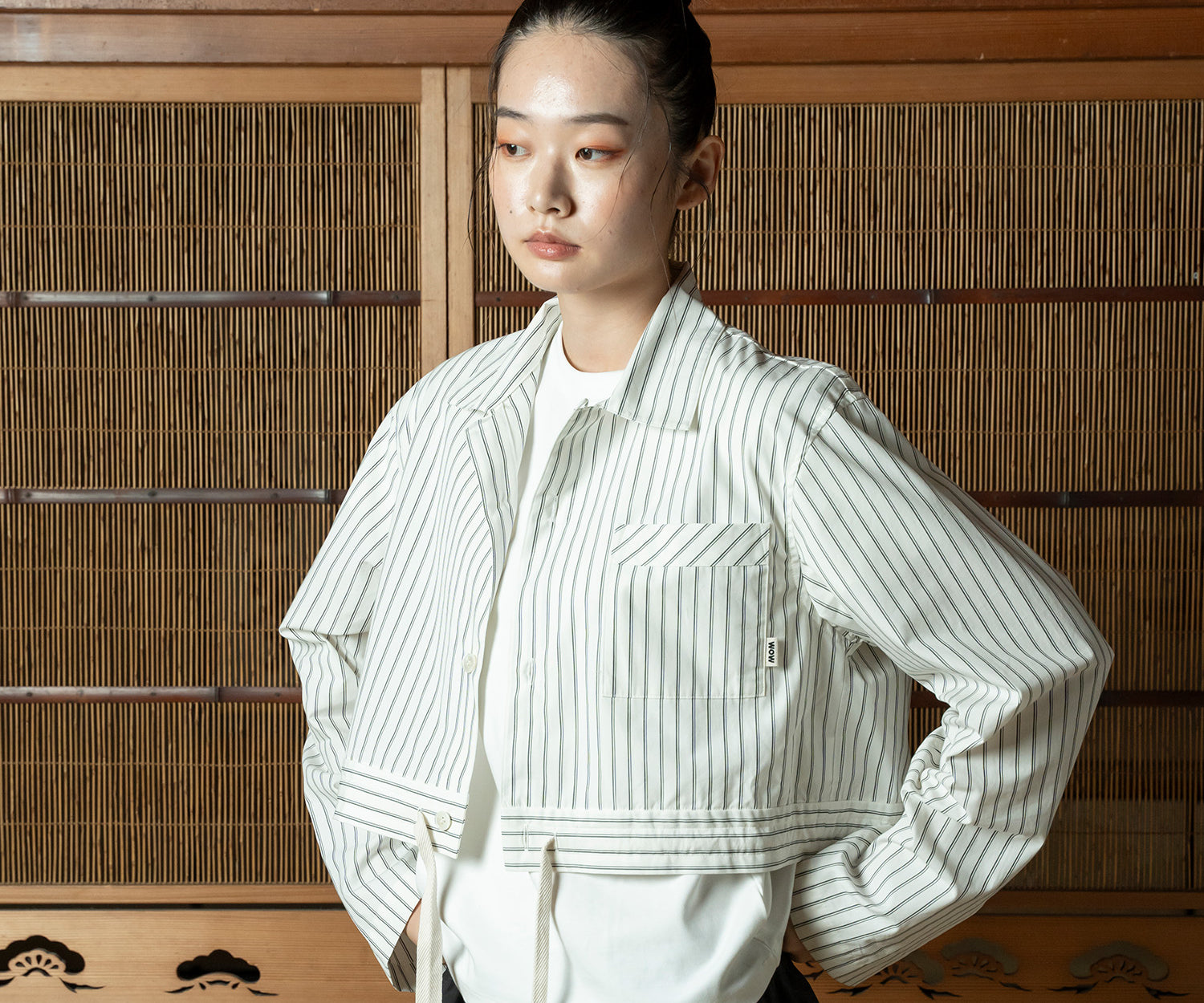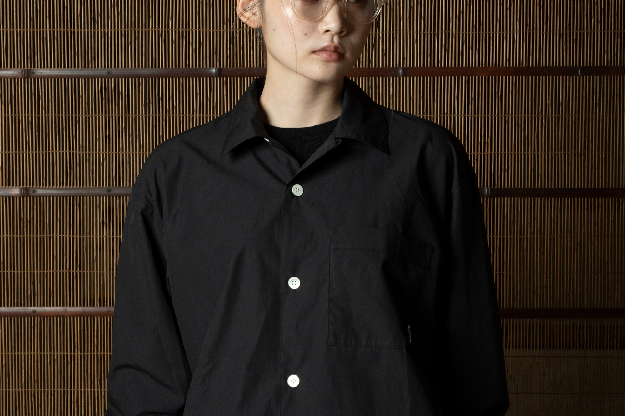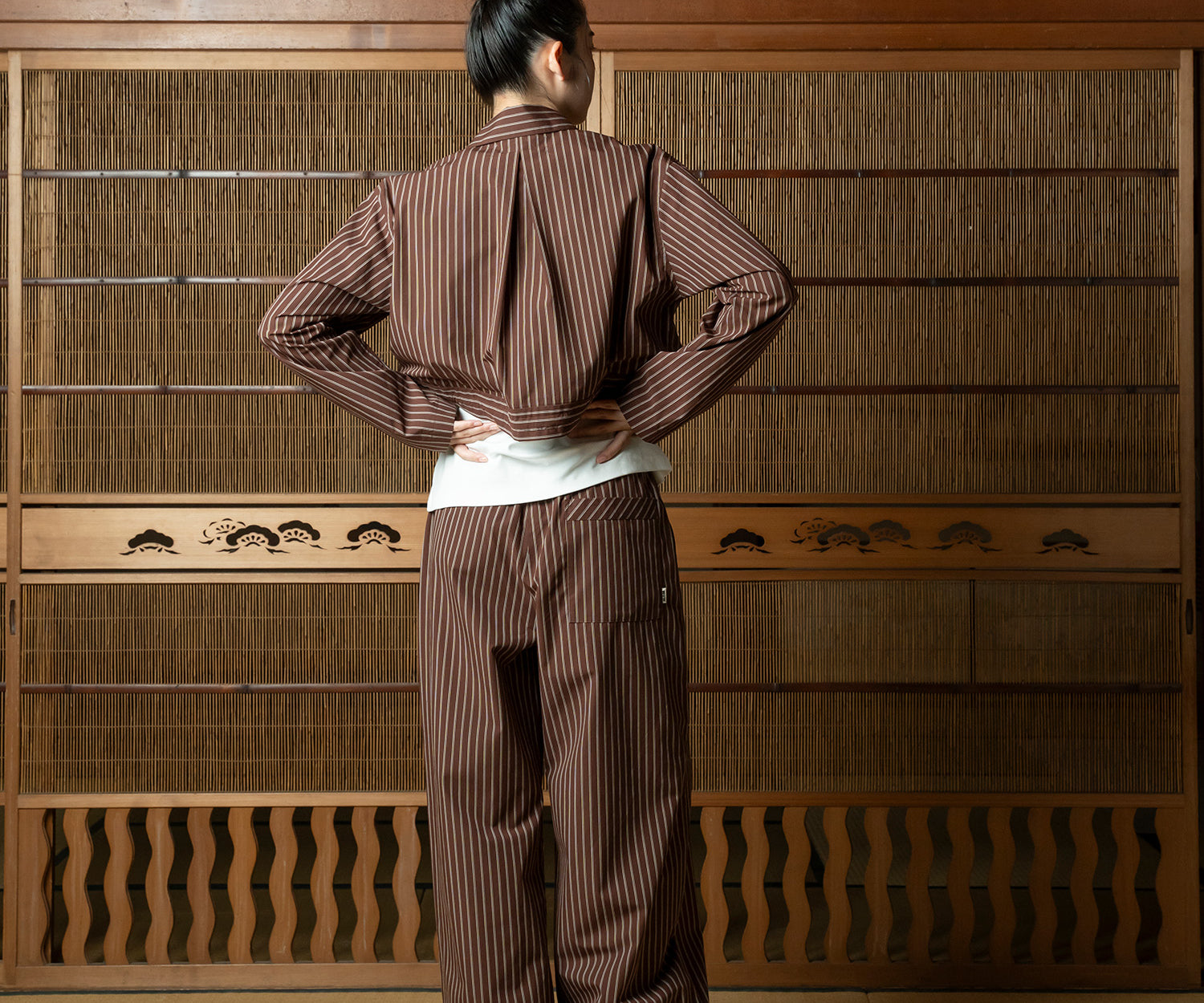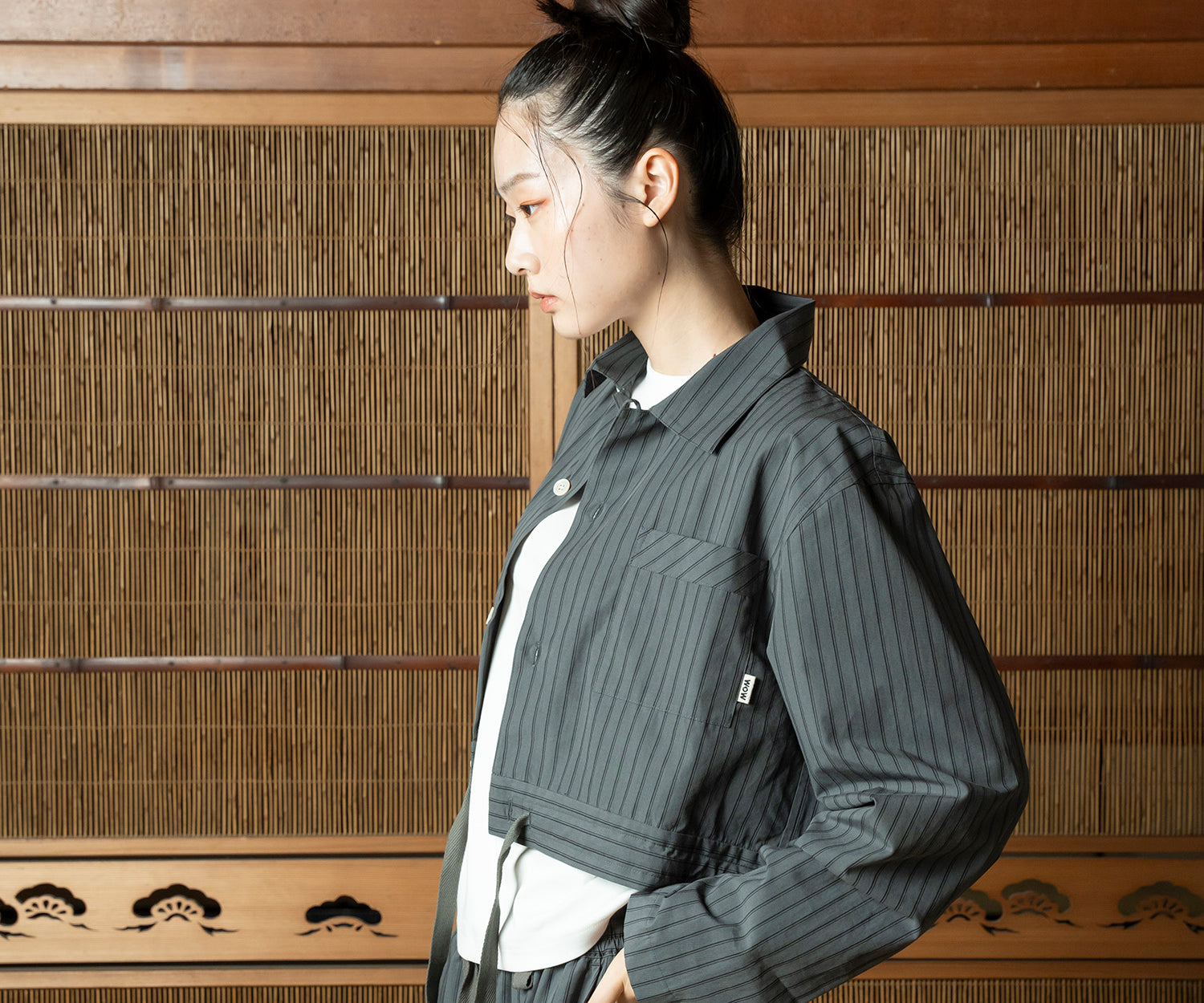 ボリュームのある背中心にプリーツの入ったボックスシルエットのオーセンティックなパジャマシャツ。丈は短めのクロップド丈で、さらに裾にドローコードを入れることによりシルエットの変化も可能です。ルームウェアとしての枠にとどまらず、「いつでもどこでも」着られるをテーマに、独自のバランスに仕立てました。