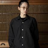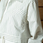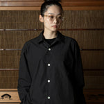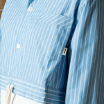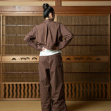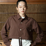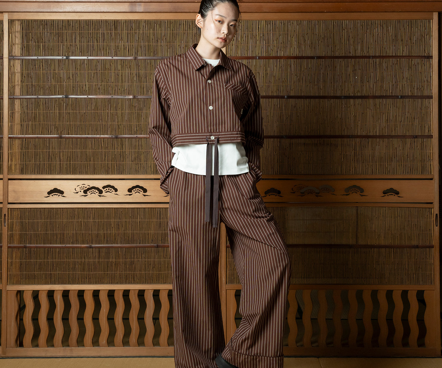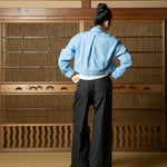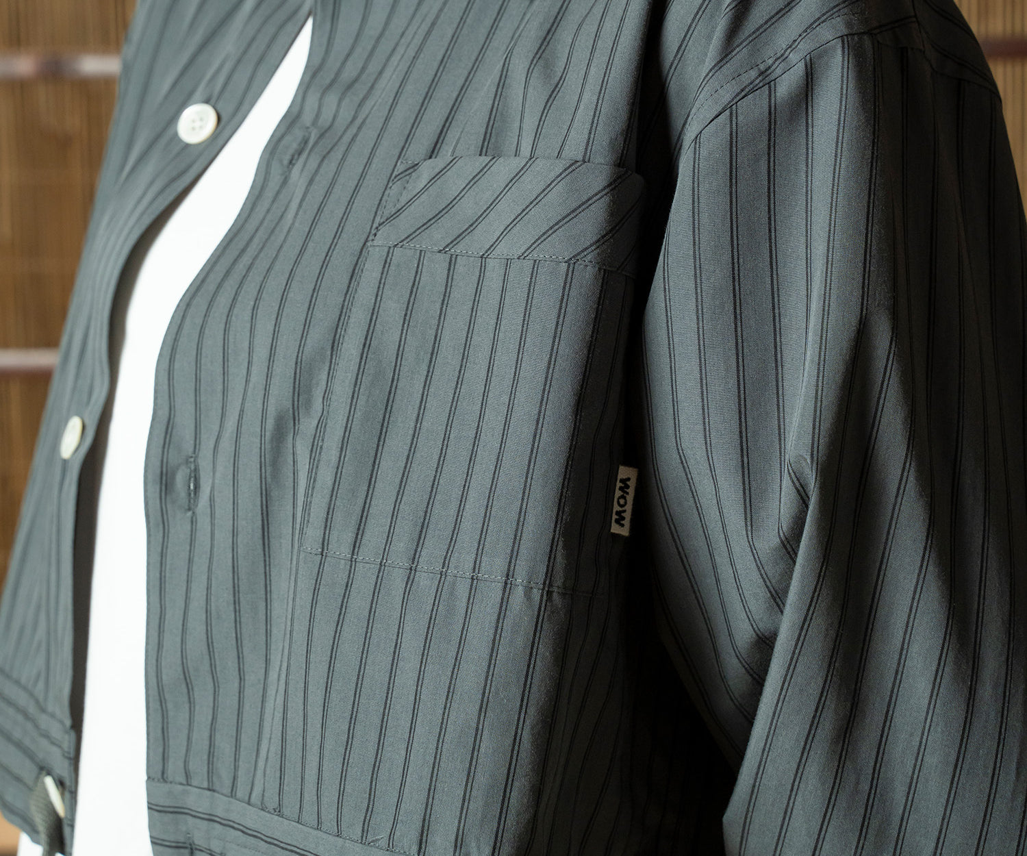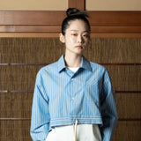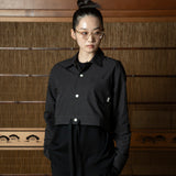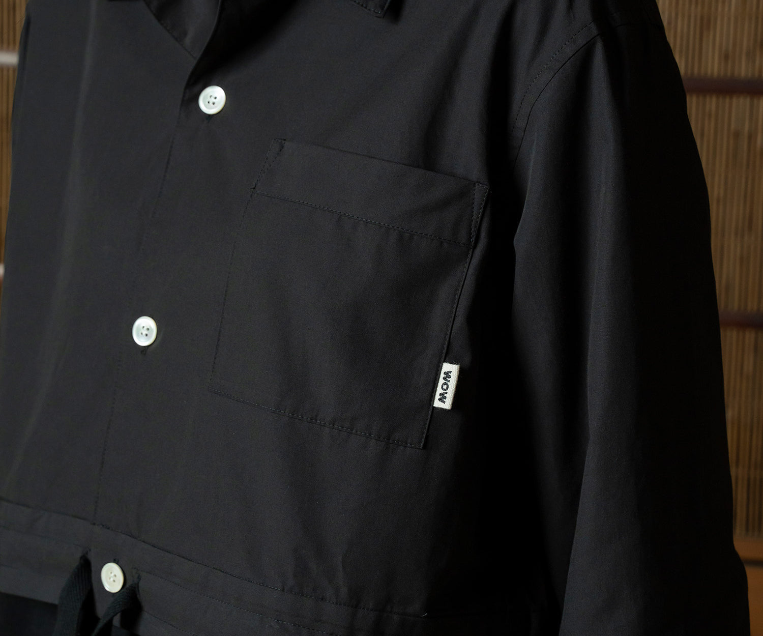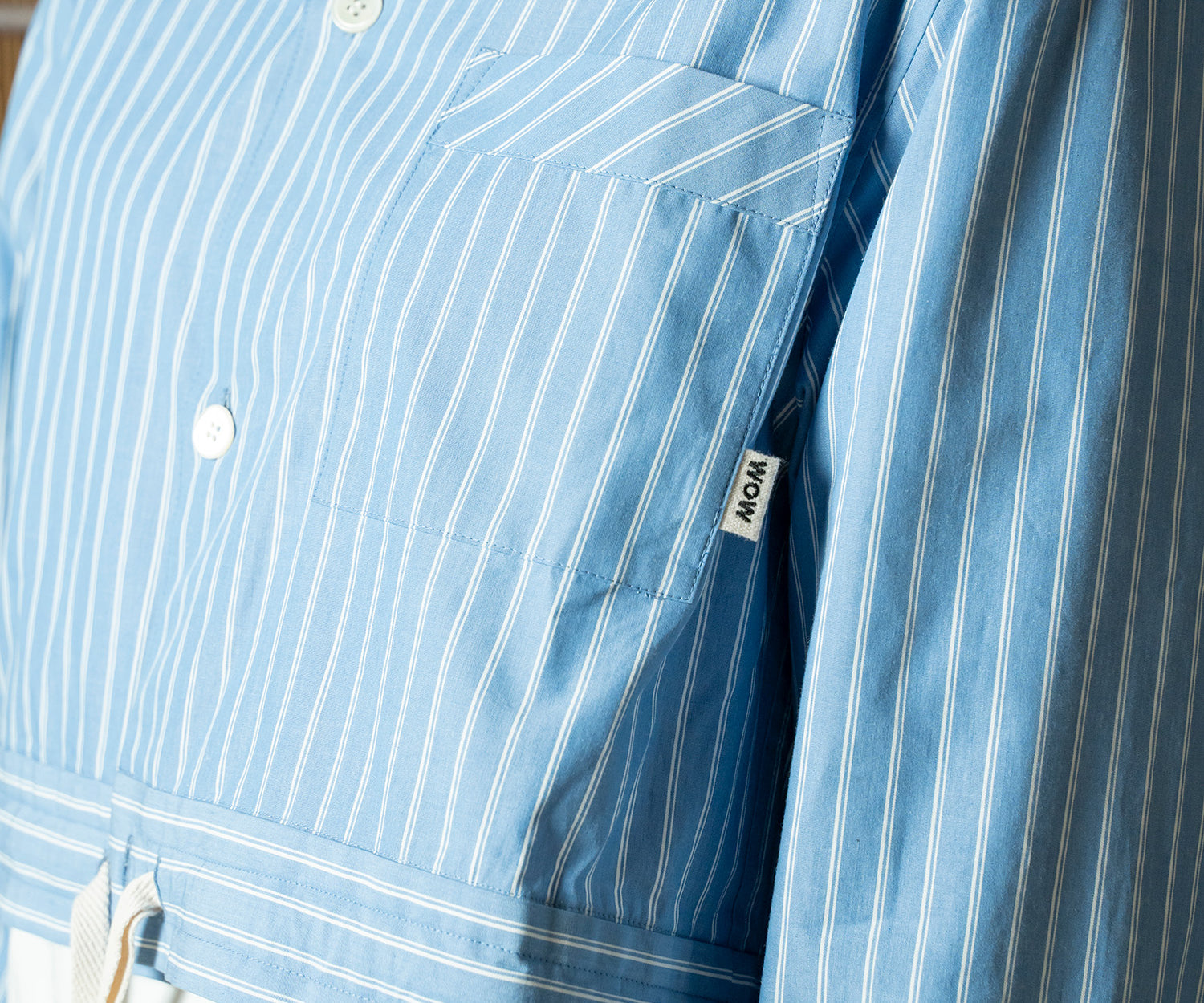 ボリュームのある背中心にプリーツの入ったボックスシルエットのオーセンティックなパジャマシャツ。丈は短めのクロップド丈で、さらに裾にドローコードを入れることによりシルエットの変化も可能です。ルームウェアとしての枠にとどまらず、「いつでもどこでも」着られるをテーマに、独自のバランスに仕立てました。