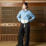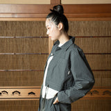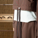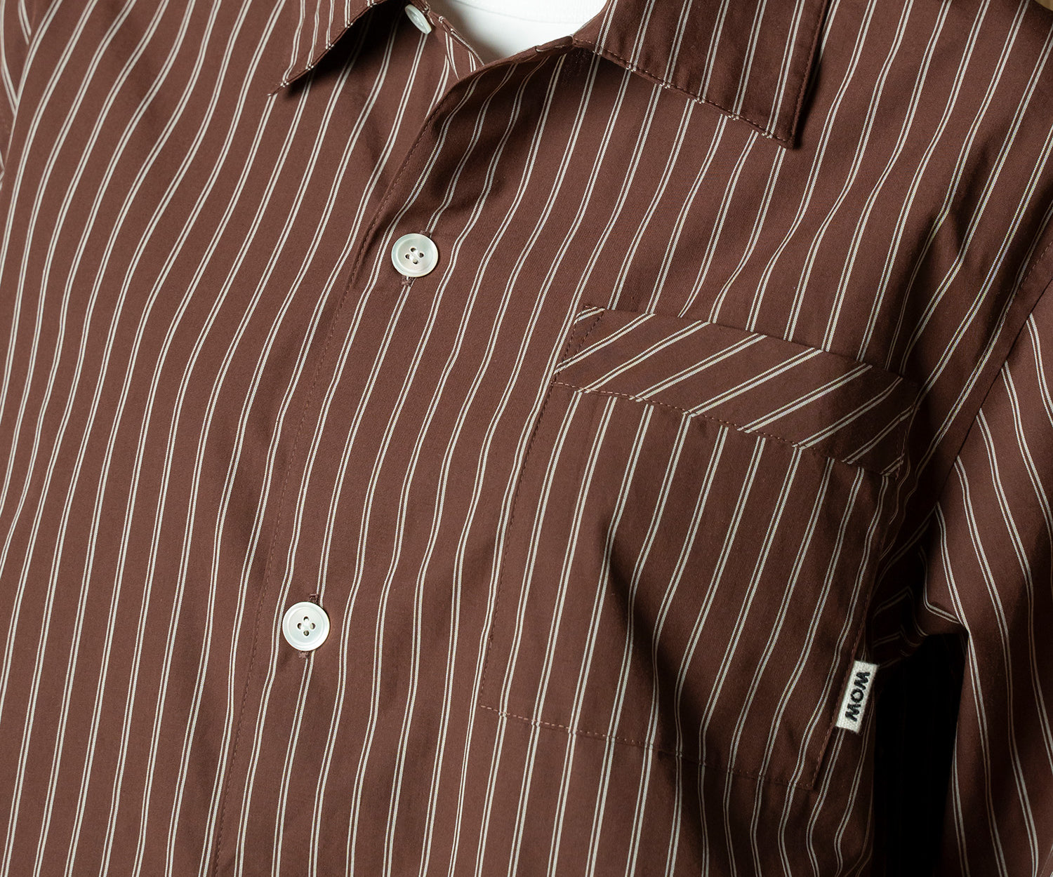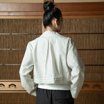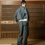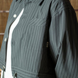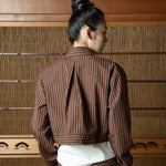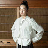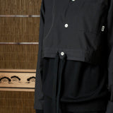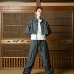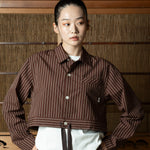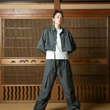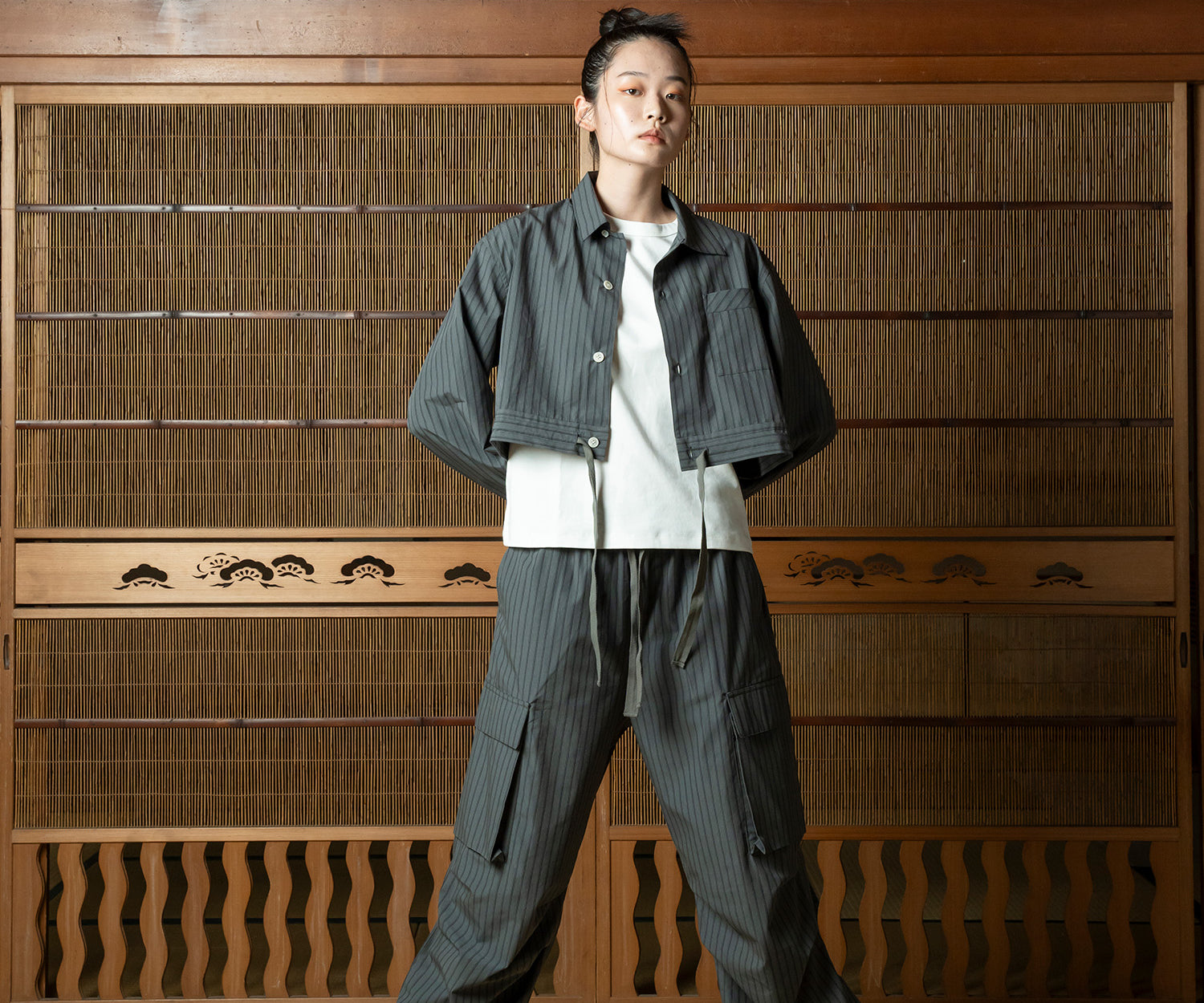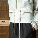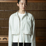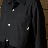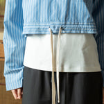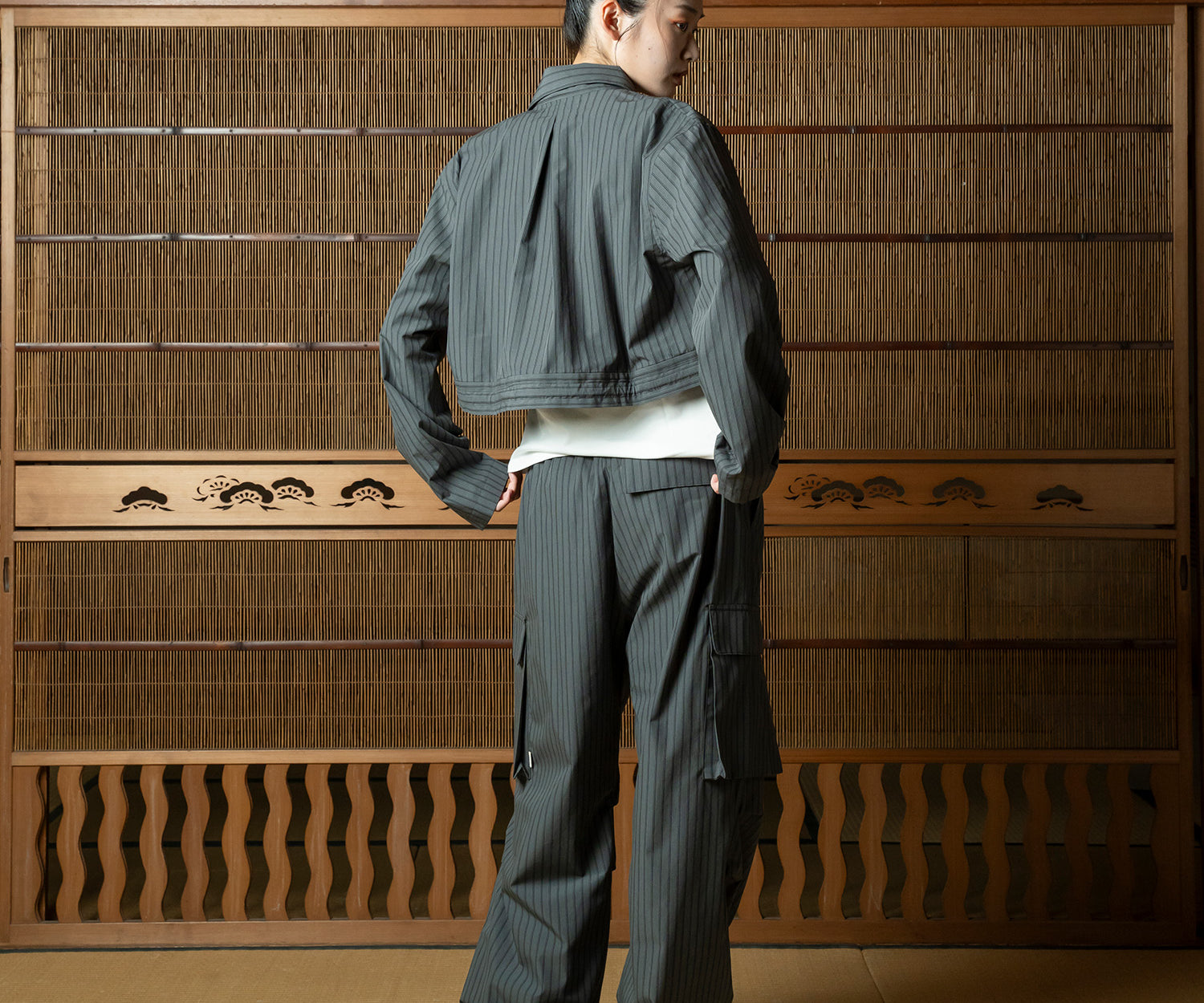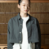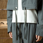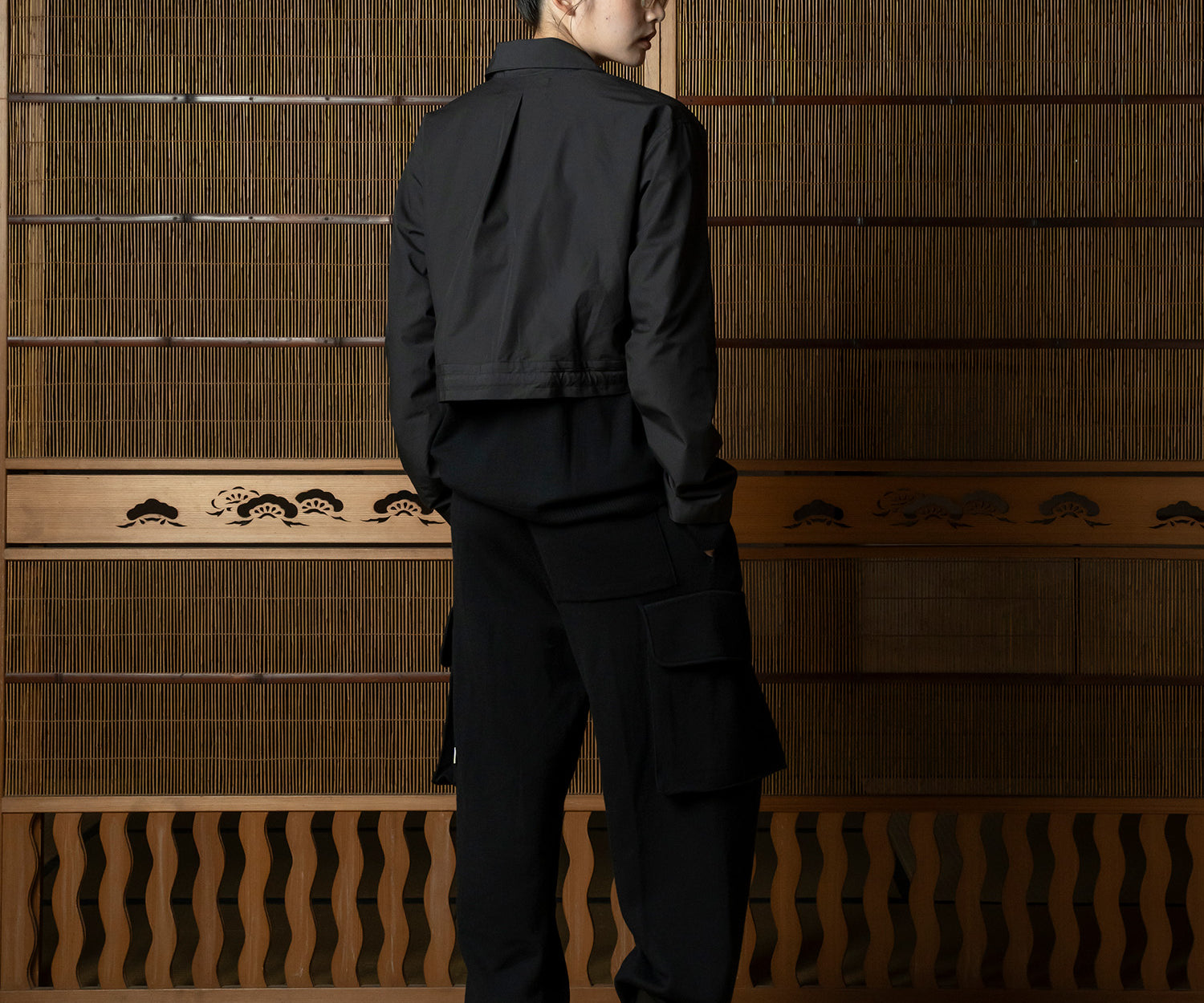 ボリュームのある背中心にプリーツの入ったボックスシルエットのオーセンティックなパジャマシャツ。丈は短めのクロップド丈で、さらに裾にドローコードを入れることによりシルエットの変化も可能です。ルームウェアとしての枠にとどまらず、「いつでもどこでも」着られるをテーマに、独自のバランスに仕立てました。
