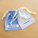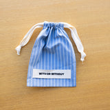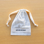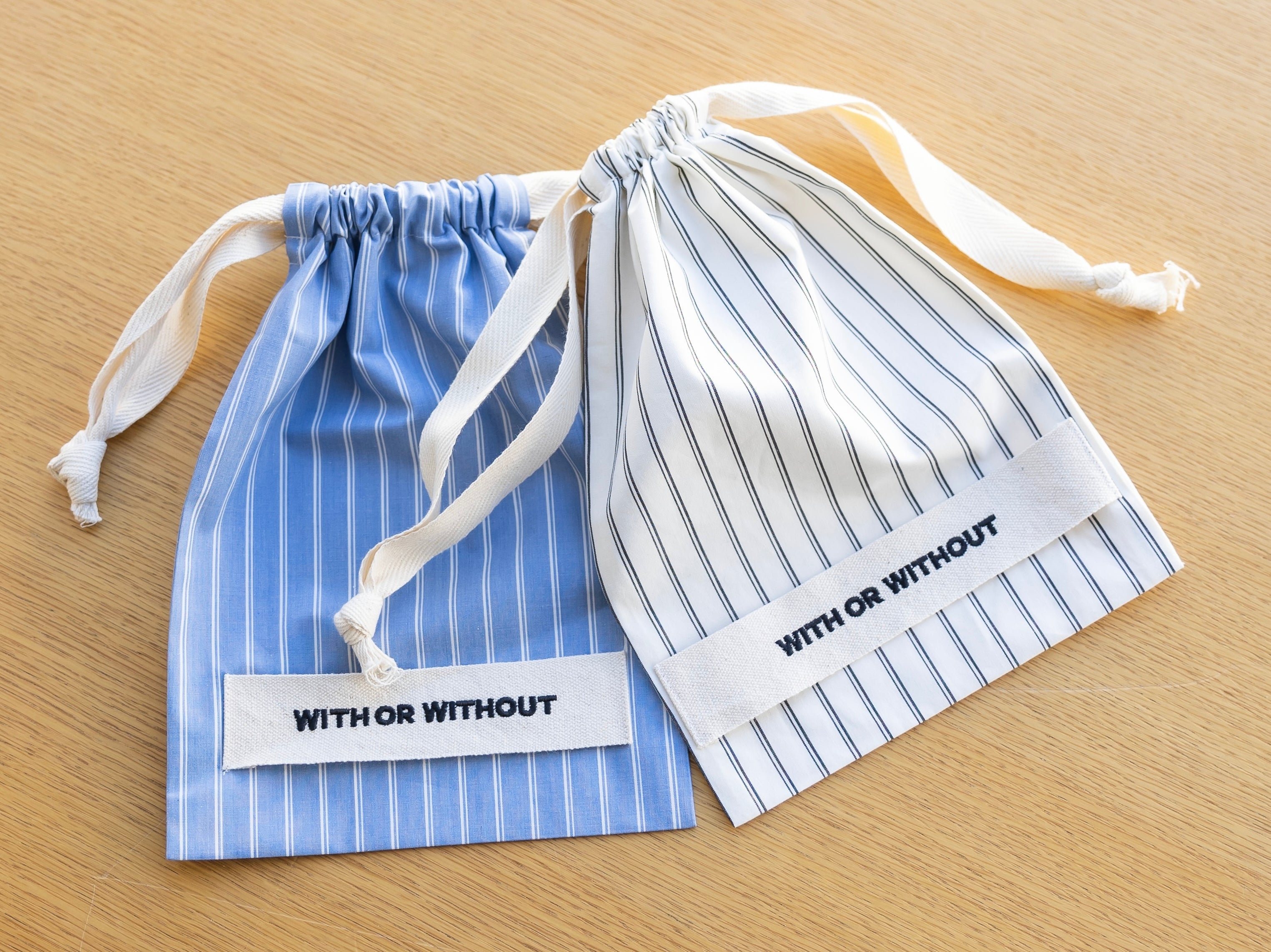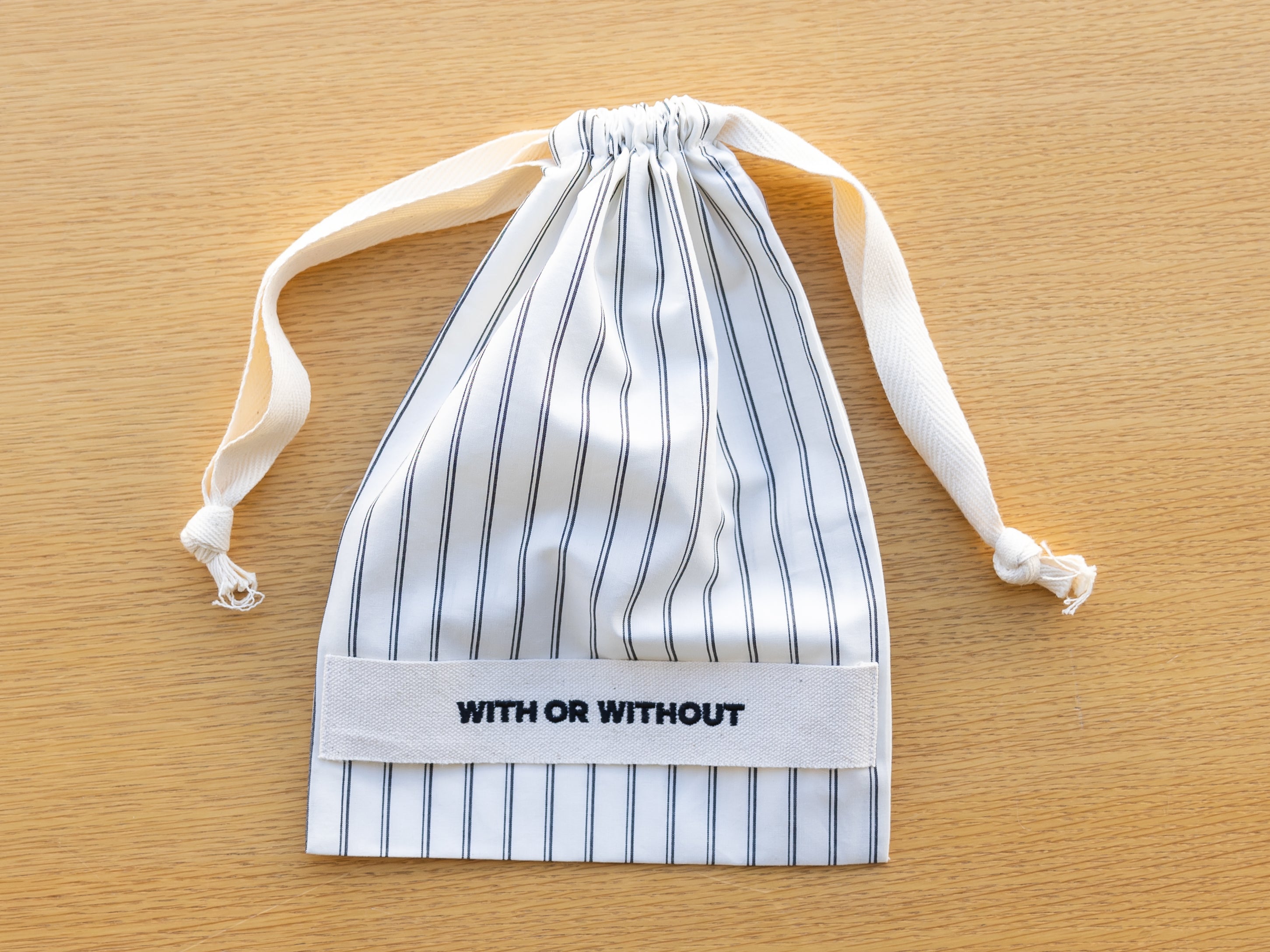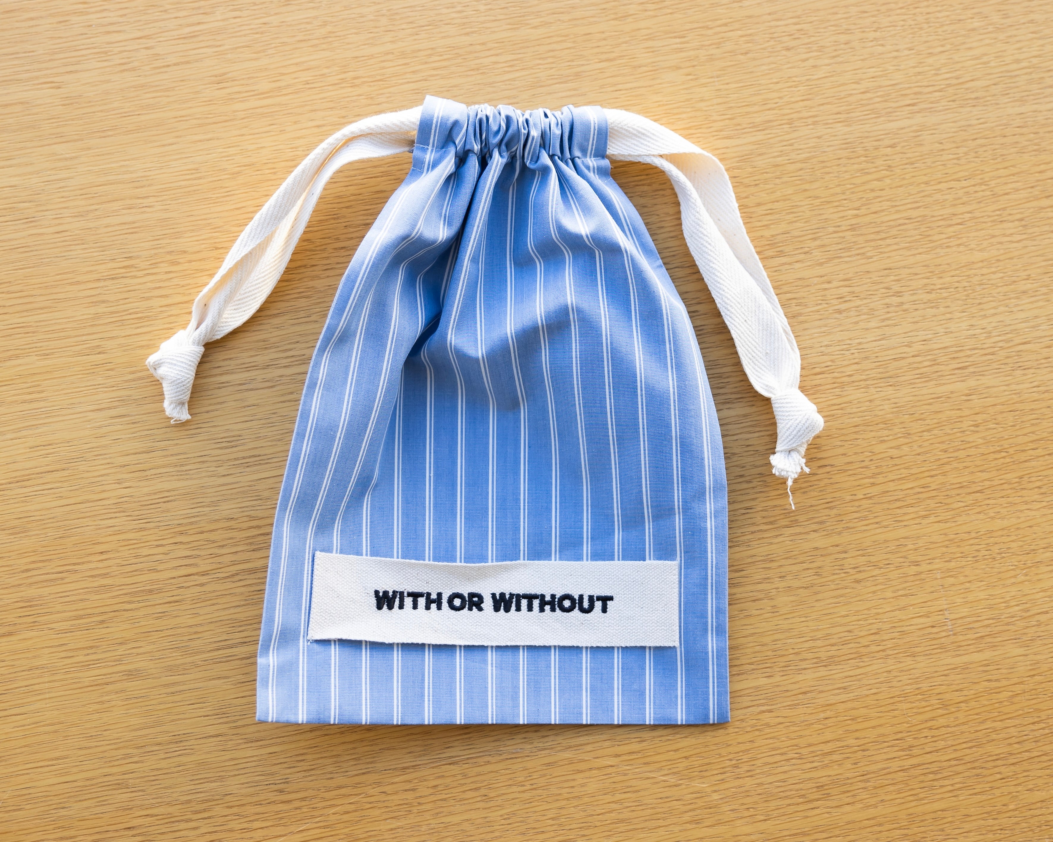 オリジナル生地から作成したミニポーチ。アパレルや寝具の製造時に出た、通常であれば捨てられてしまいファッションロスの原因の一つとされています。そこに着目したWITH OR WITHOUTはその廃棄されるはずの生地を有効活用したプロダクトを展開。天然繊維という有限の原料を使ったものづくりをさせていただいているブランドとして、製造過程からロスを極力出さないという観点でサスティナブルに貢献したアイテムとなります。