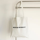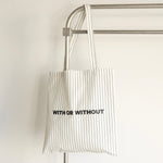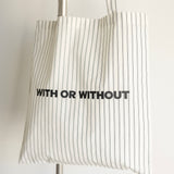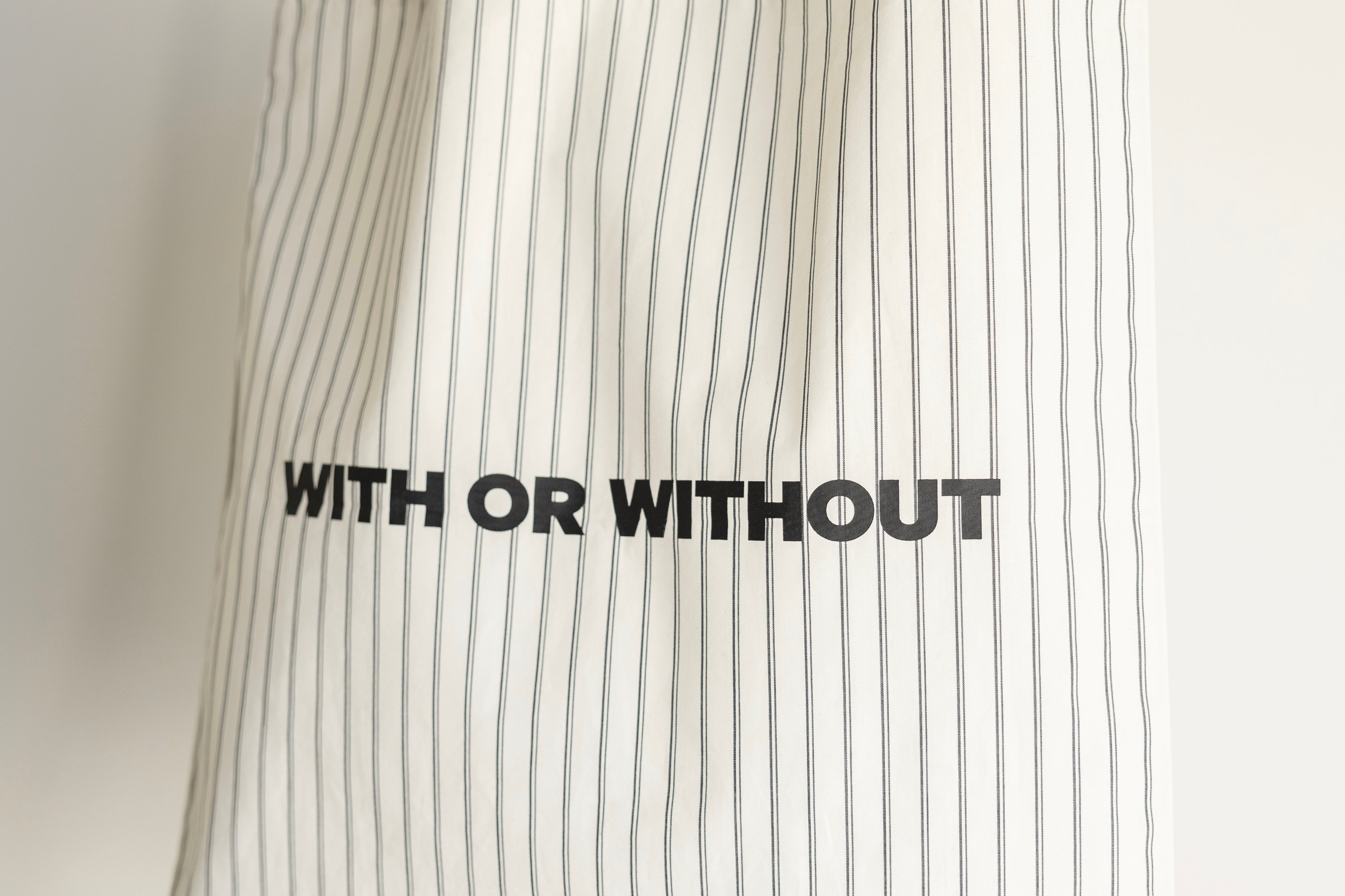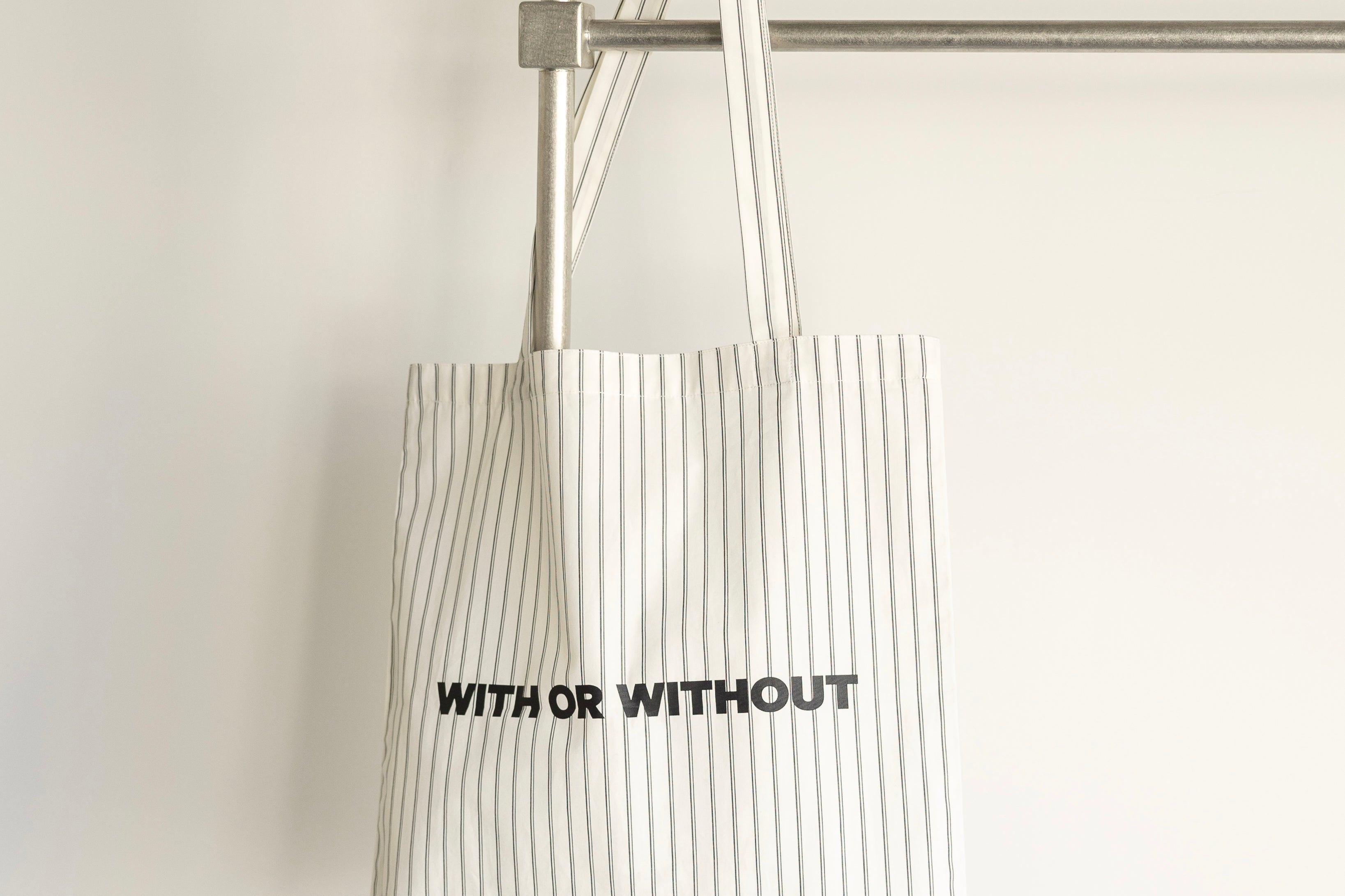 ナイトウェア、寝具と同じ素材を使用した、オリジナルトートバッグです。肩がけ可能な長めのショルダー。A4サイズやパソコンも入るサブバックにぴったりなサイズです。アパレルや寝具の製造時に出た、通常であれば捨てられてしまいファッションロスの原因の一つとされています。そこに着目したWITH OR WITHOUTはその廃棄されるはずの生地を有効活用したプロダクトを展開。天然繊維という有限の原料を使ったものづくりをさせていただいているブランドとして、製造過程からロスを極力出さないという観点でサスティナブルに貢献したアイテムとなります。