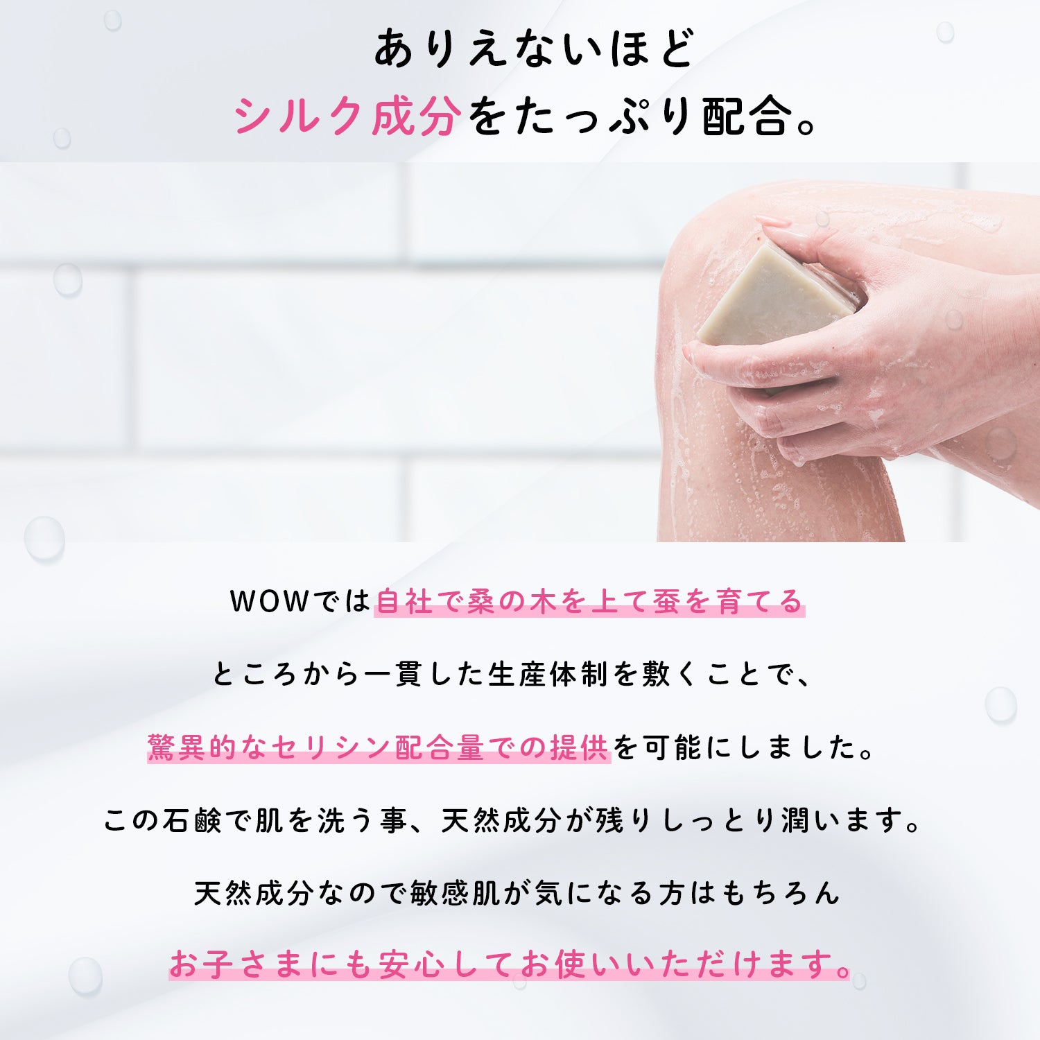 泡立てネットを使用し、顔やカラダを洗った後に、5〜10秒程度の「泡パック」をおすすめします。石鹸に含まれるシルク由来のタンパク質セリシンは、保湿・保水力が優れている成分であり、その肌状態を長時間保つ働きもあります。角質層までしっかり成分を浸透することでしっとりと洗いあがり、保湿・保水効果が継続します。サイズ・商品詳細