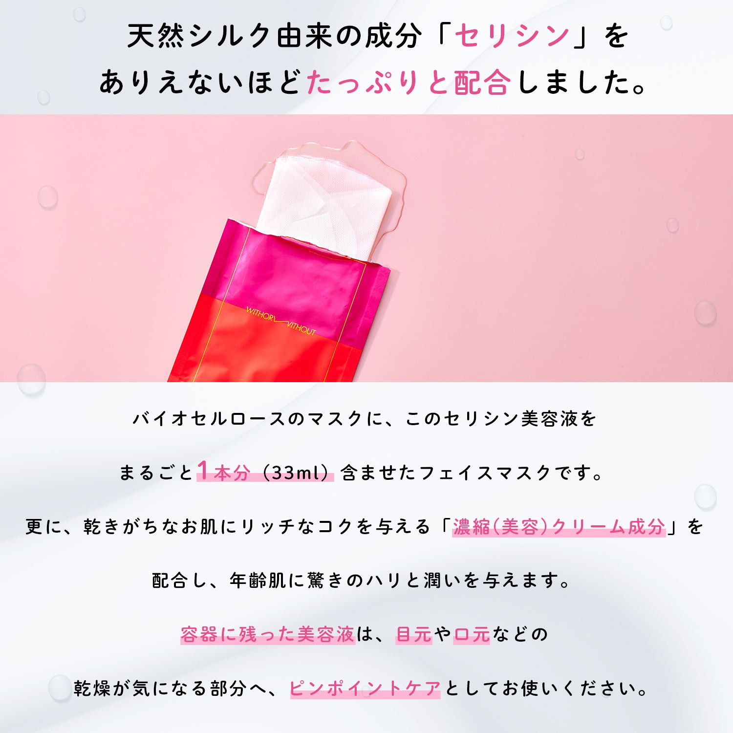 1、 群馬県桐生市の無農薬自家養蚕からとれたシルク成分、セリシン美容液をまるごと 1 本分( 33ml )含ませたフェイスマスクで高級シルクタンパク質で肌の組織を修復、保湿を実現、安心安全の日本製。