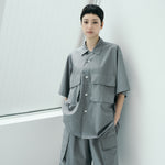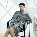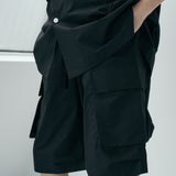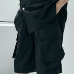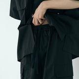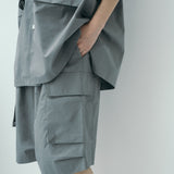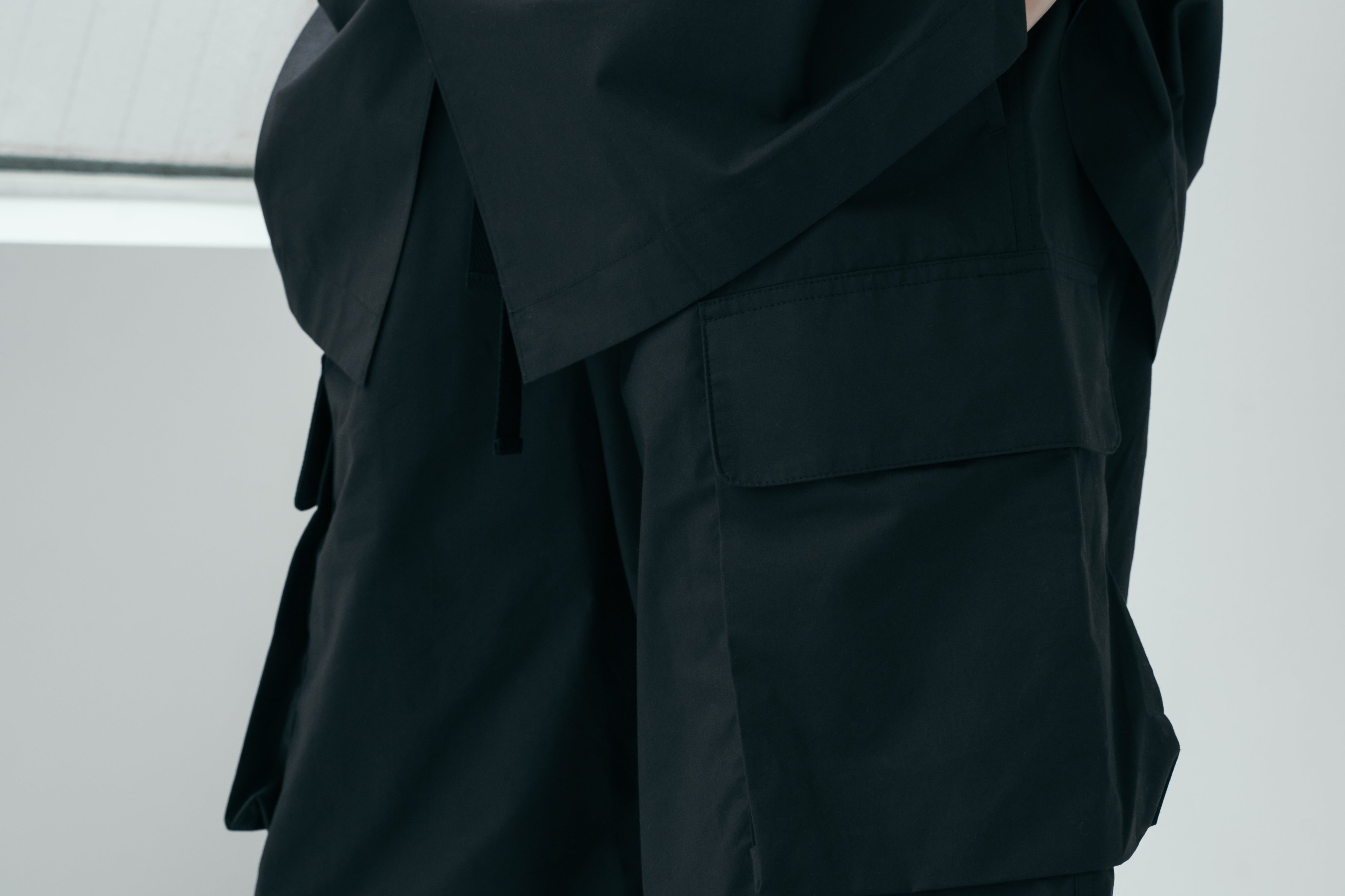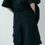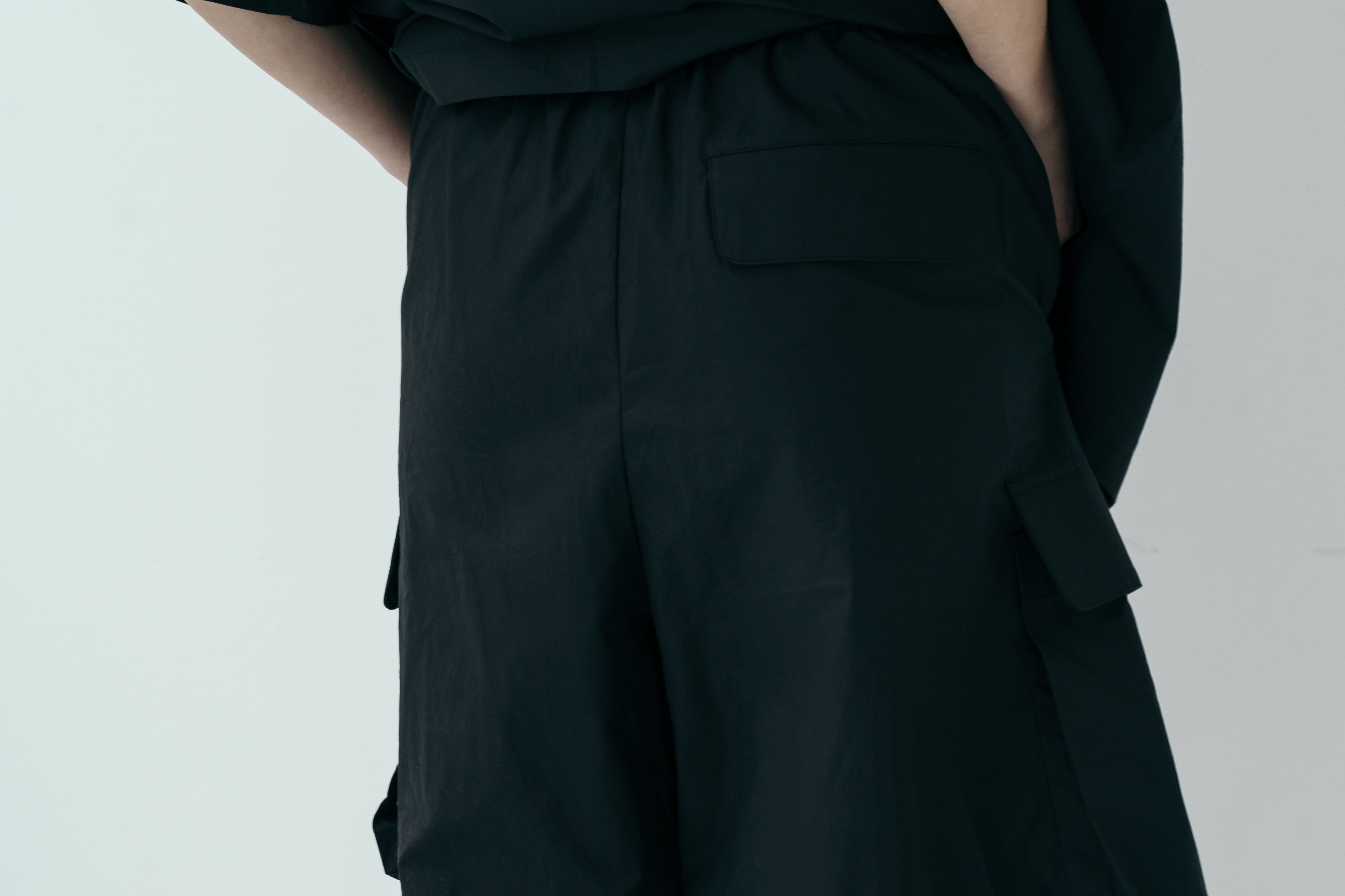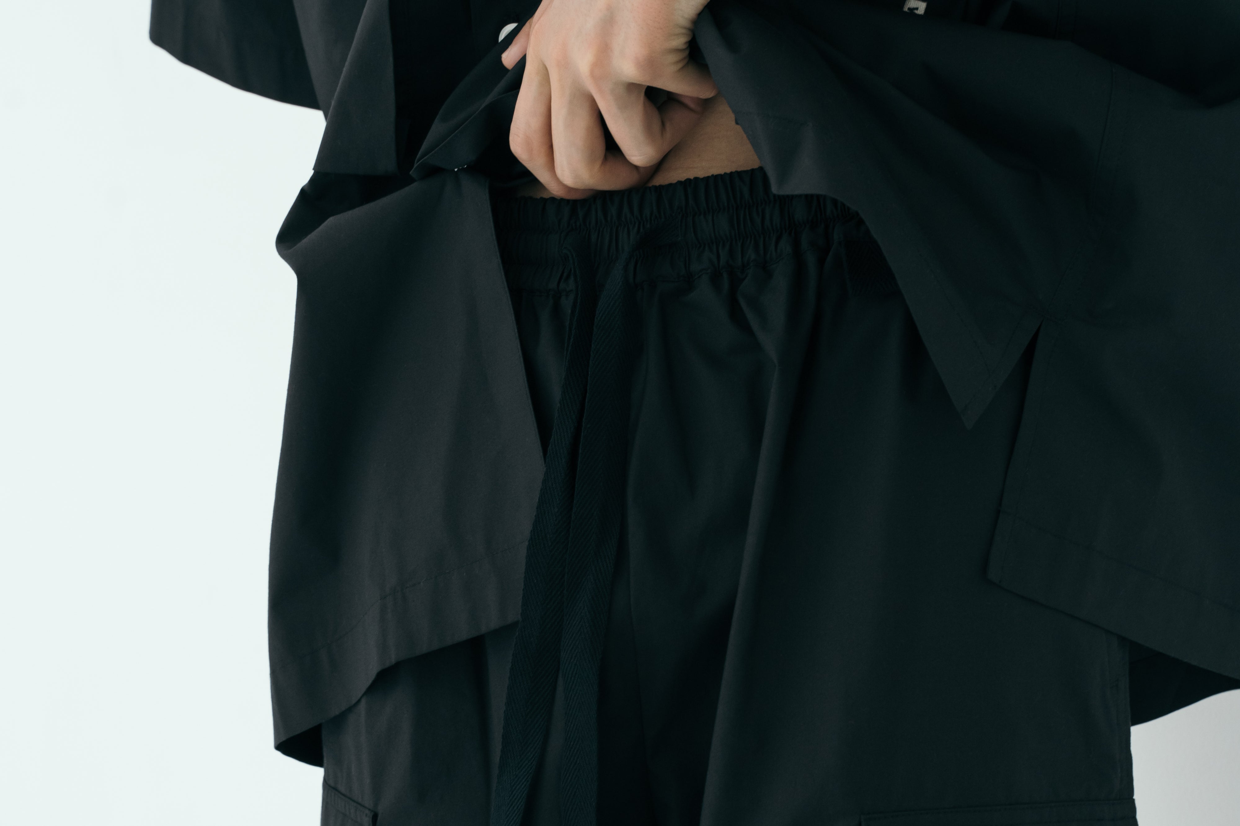 ワイドシルエットで、両脇に立体的な大きなポケットを配したカーゴショートパンツ。 ウエストにキーループのディテール、裾にドローコード、ひざに立体的なタックを入れることによりルームウェアとしての枠にとどまらず、「いつでもどこでも」着られるをテーマに独自のバランスに仕立てました。ユニセックスでのサイズ展開でジェンダーや体型にとらわれることなく、着る人の好みのバランスで着用いただけます。