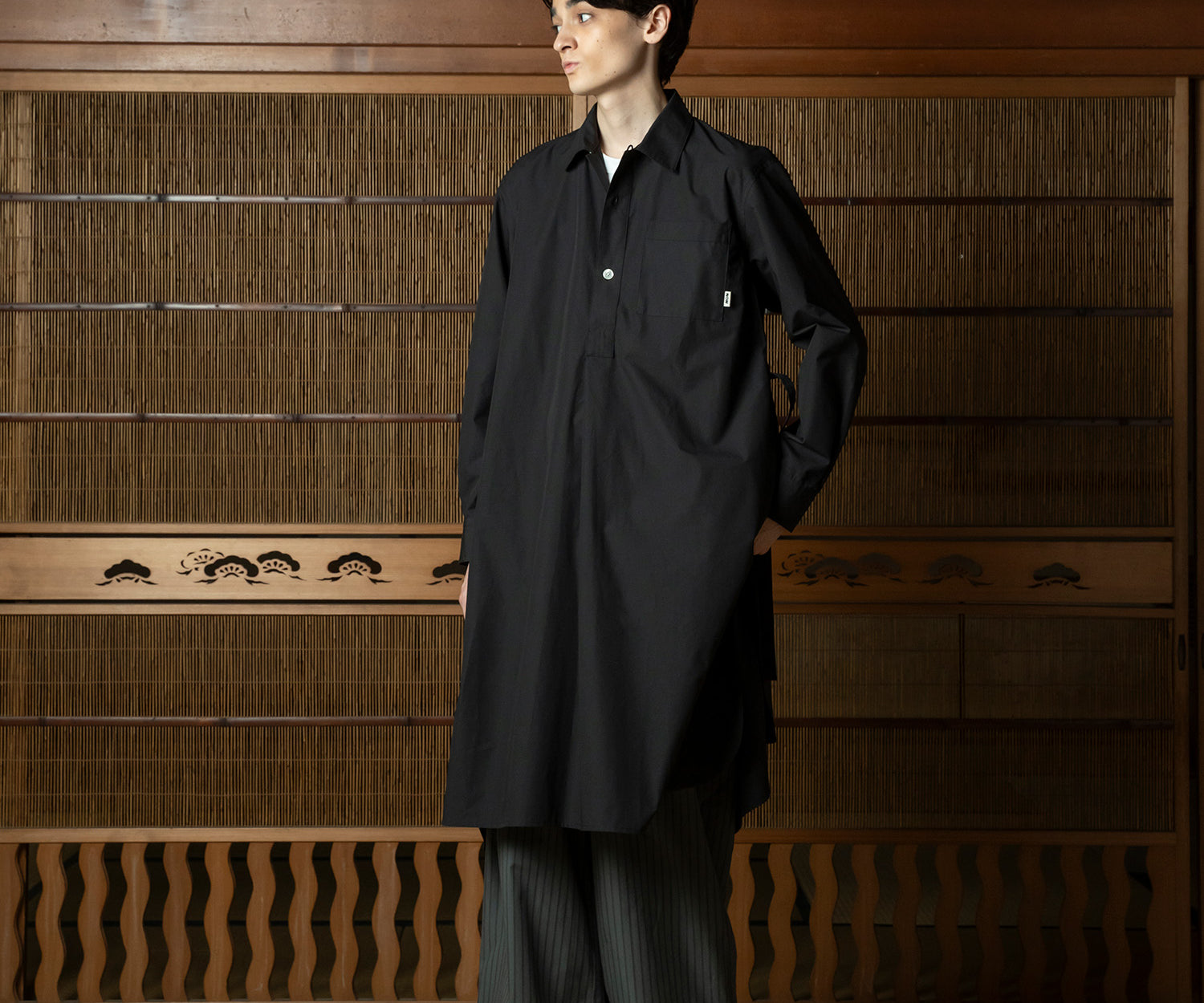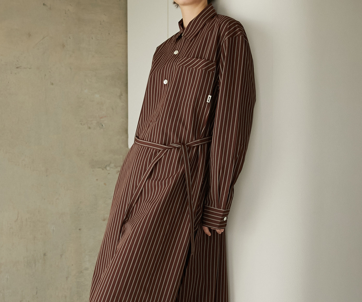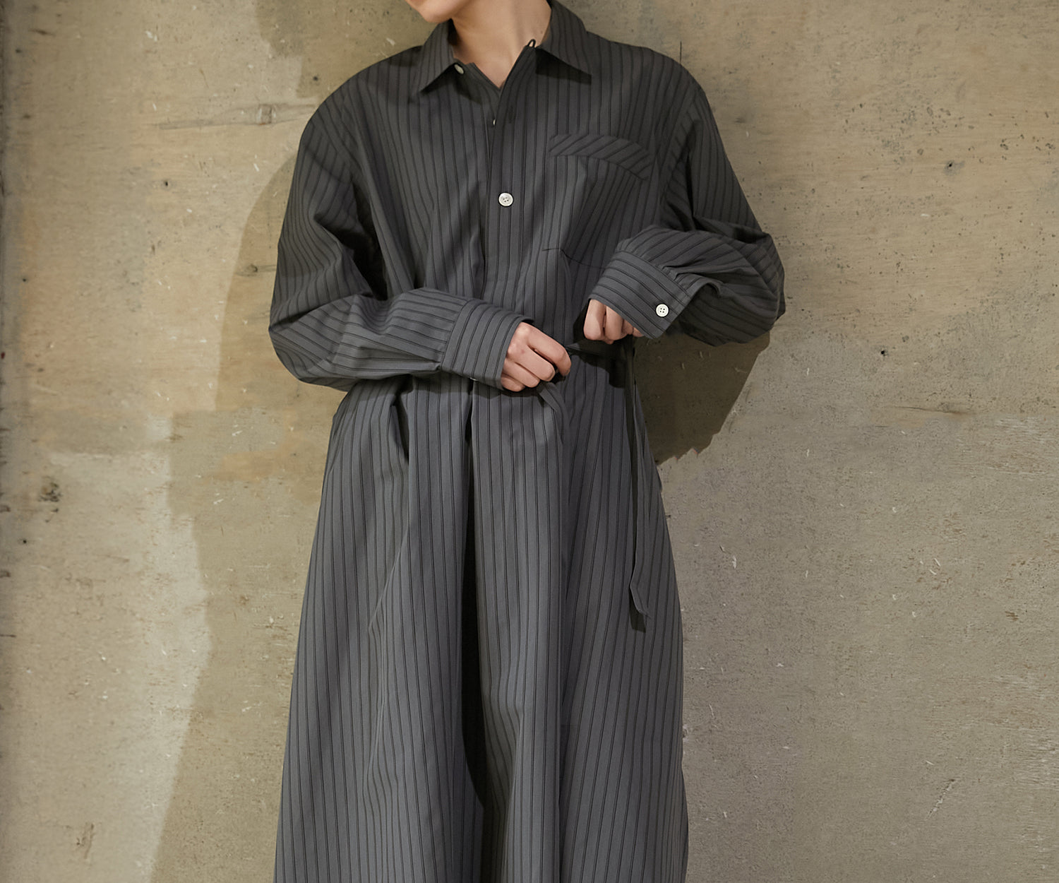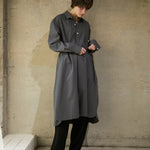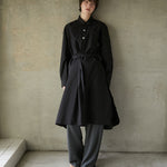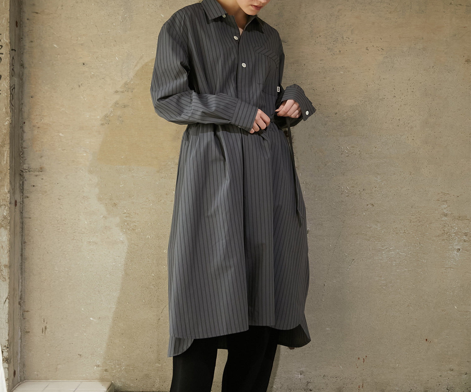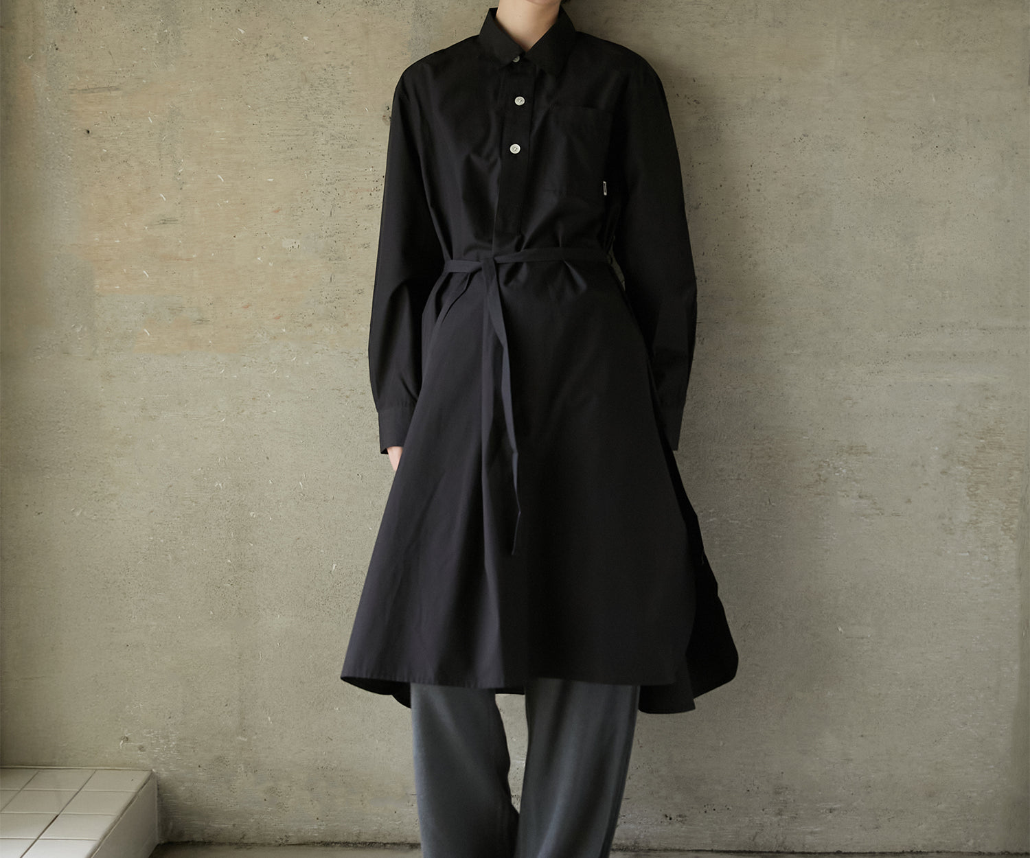 ブランド初のロングシャツ。シルエットは裾に向けて大きく広がるAラインシルエットになっており、1枚で存在感のあるコーディネートが可能。長めに設計された丈感なので、女性だけでなく男性もカジュアルウェアとしても着用可能です。腰元には紐が付属しているので、気分やコーディネートに合わせてシルエットの調整ができ色々な着こなし方ができるアイテムです。