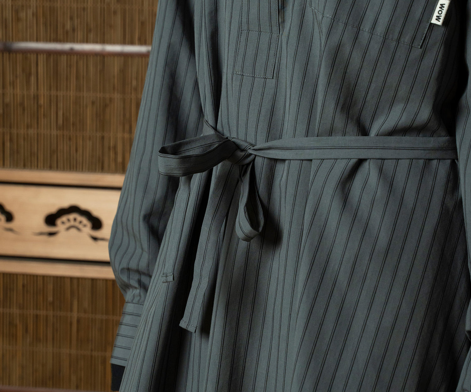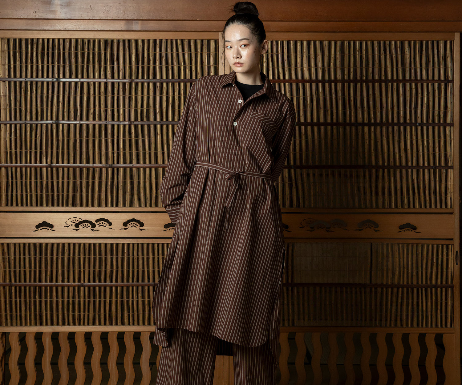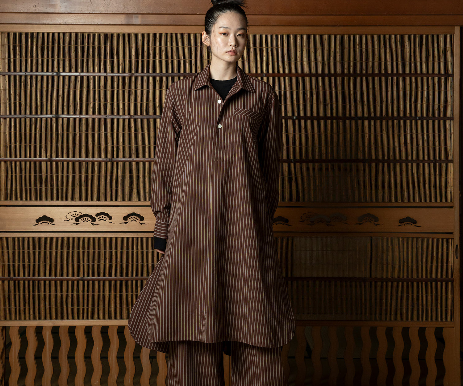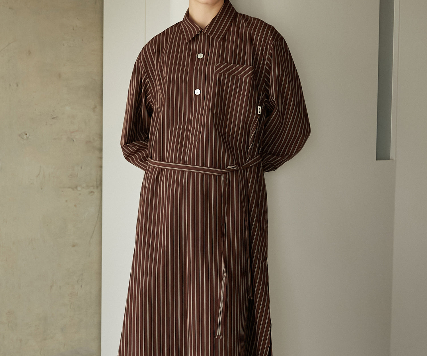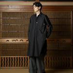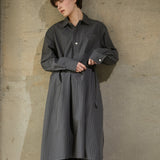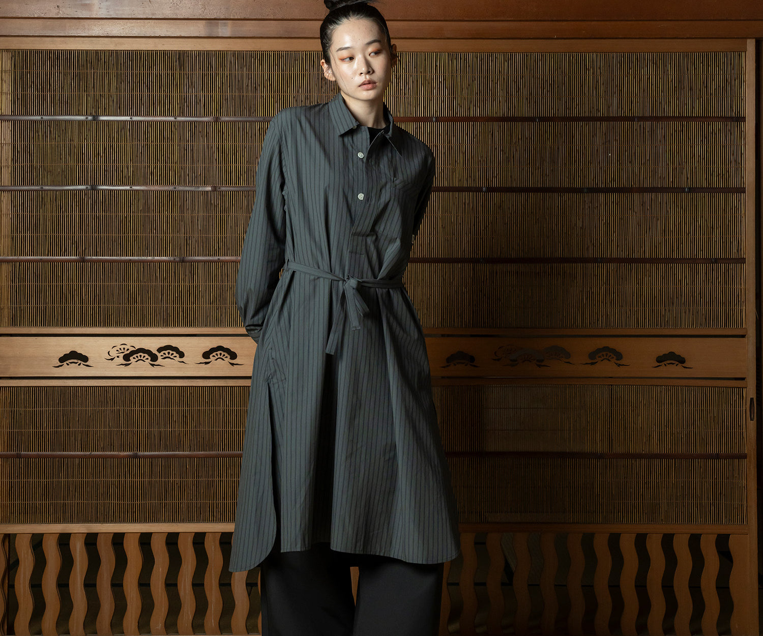 ブランド初のロングシャツ。シルエットは裾に向けて大きく広がるAラインシルエットになっており、1枚で存在感のあるコーディネートが可能。長めに設計された丈感なので、女性だけでなく男性もカジュアルウェアとしても着用可能です。腰元には紐が付属しているので、気分やコーディネートに合わせてシルエットの調整ができ色々な着こなし方ができるアイテムです。
